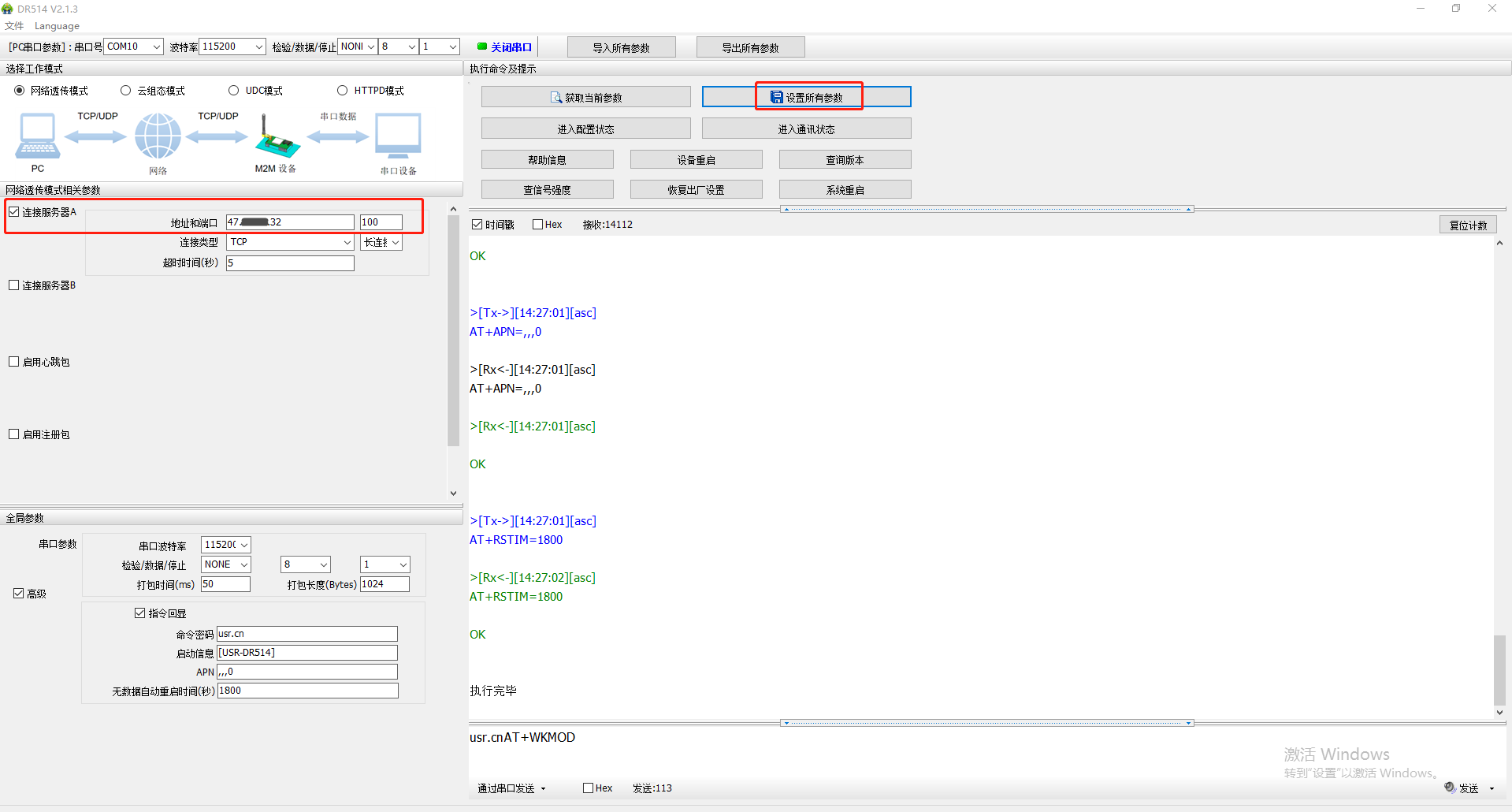 5、選擇網(wǎng)絡(luò)透傳模式,勾選連接服務(wù)器A,地址填遠程服務(wù)器地址,端口用100,點擊設(shè)置所有參數(shù),點擊設(shè)備重啟,然后再關(guān)閉串口。