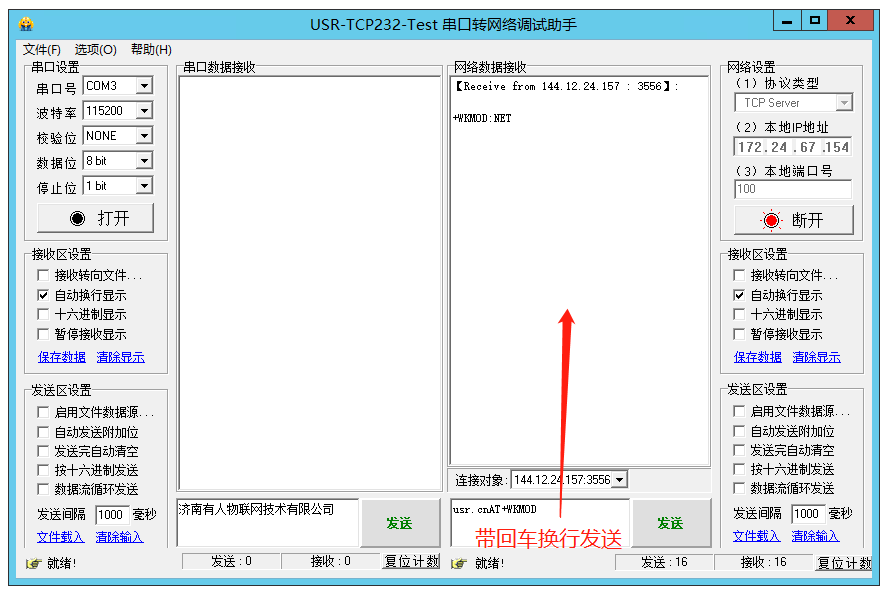 以查詢工作模式為例,發(fā)送usr.cnAT+WKMOD,后面帶回車換行,網(wǎng)絡(luò)助手接收到查詢到的AT指令參數(shù)。