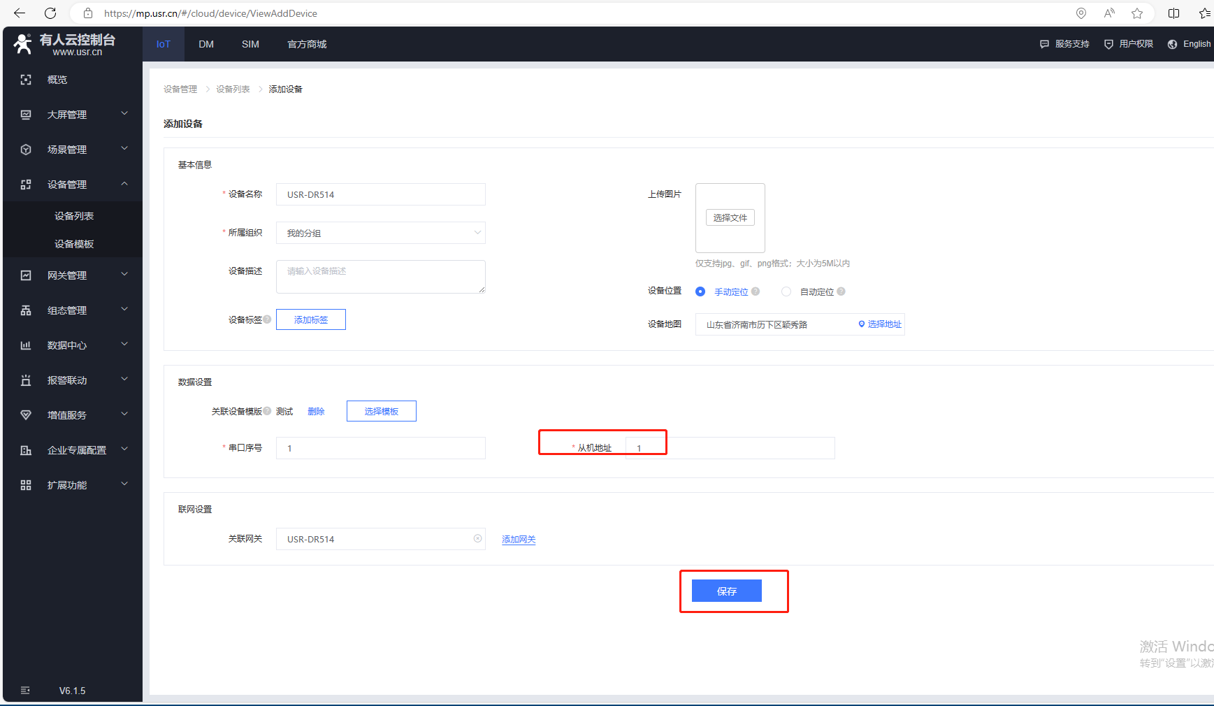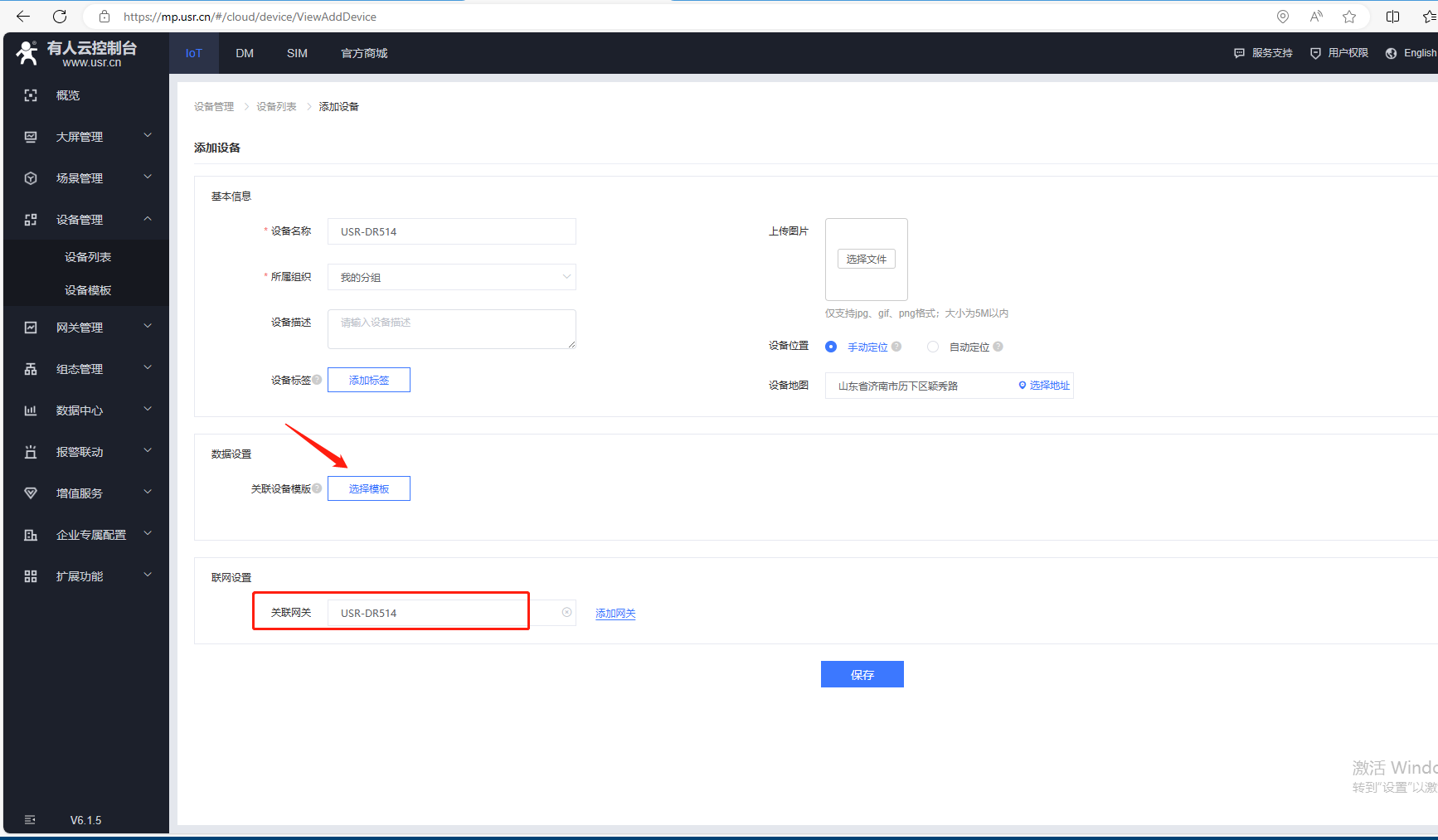 聯網設置,關聯網關選擇自身設備,USR-DR514,最后點擊保存。
