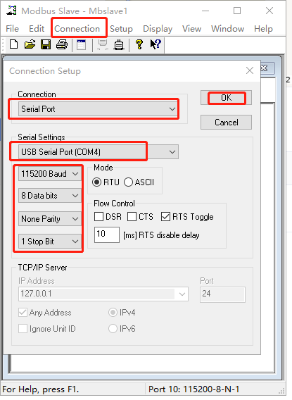 (2)點擊Connection,選擇串口,對應USR-DR514所接USB-RS485串口線的COM口號,串口參數和USR-DR514串口參數保持一致。 Mode選擇RTU,模擬MODBUS RTU協議串口。