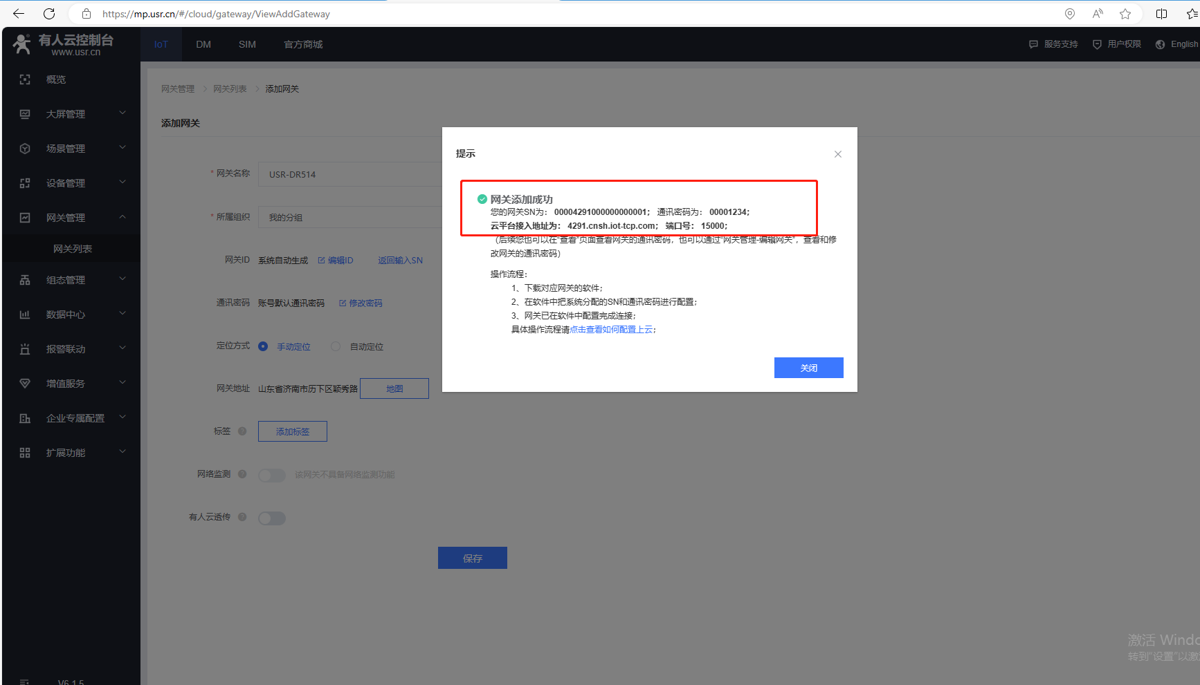 您的網關SN為: 00004291000000000001; 通訊密碼為: 00001234;