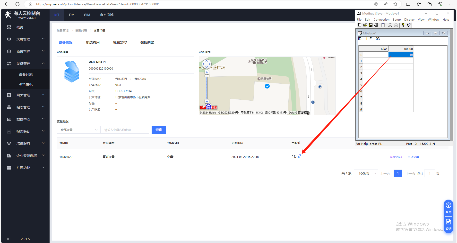 2、MODBUS slave數據設置10,有人云設備列表1分鐘采集,可以看到變量采集的當前值數據10。