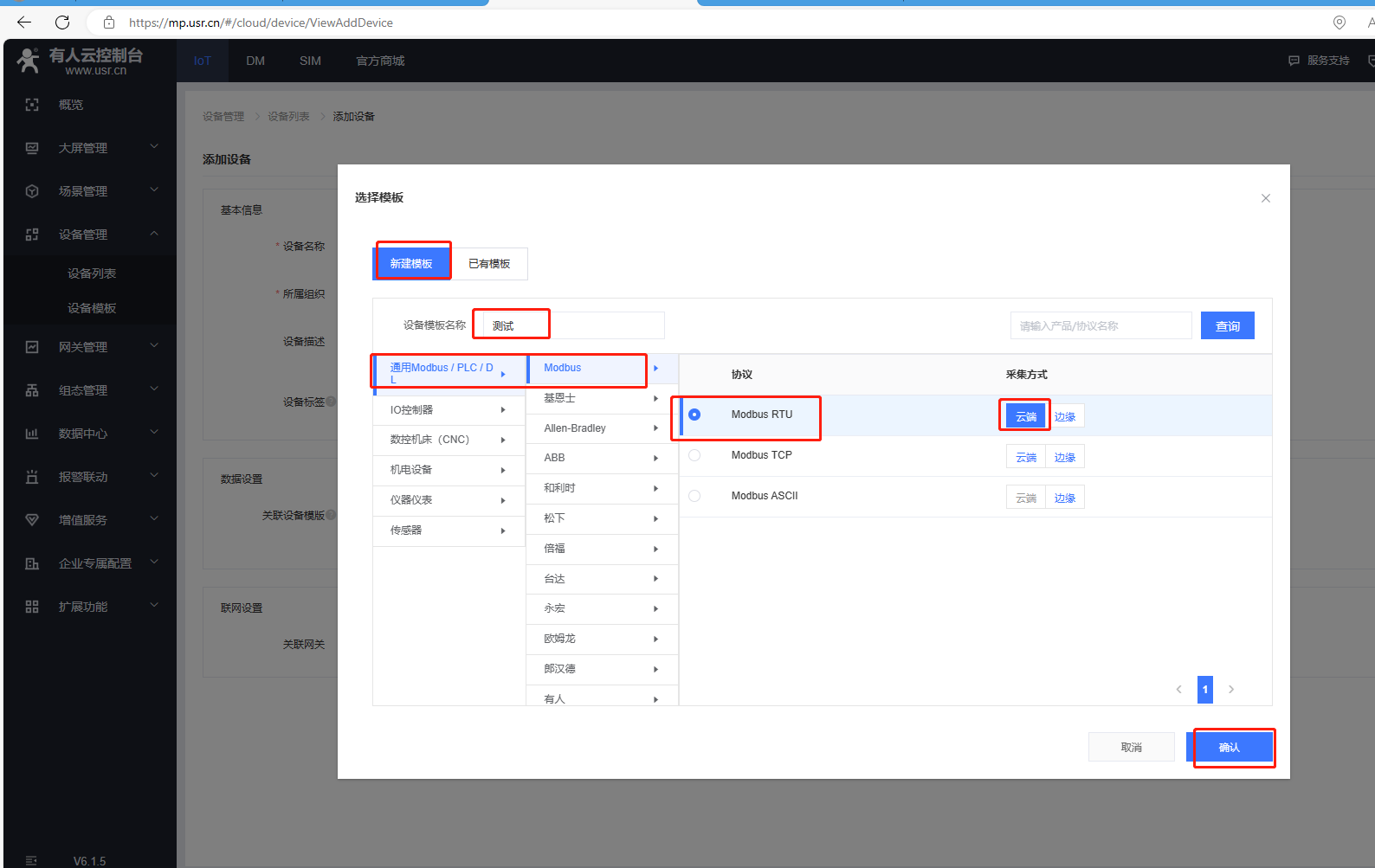 選擇新建模板,輸入設備模板名稱,通用Modbus/PLC/DL,選擇Modbus,協議選擇Modbus Rtu,采集方式云端,最后確認。