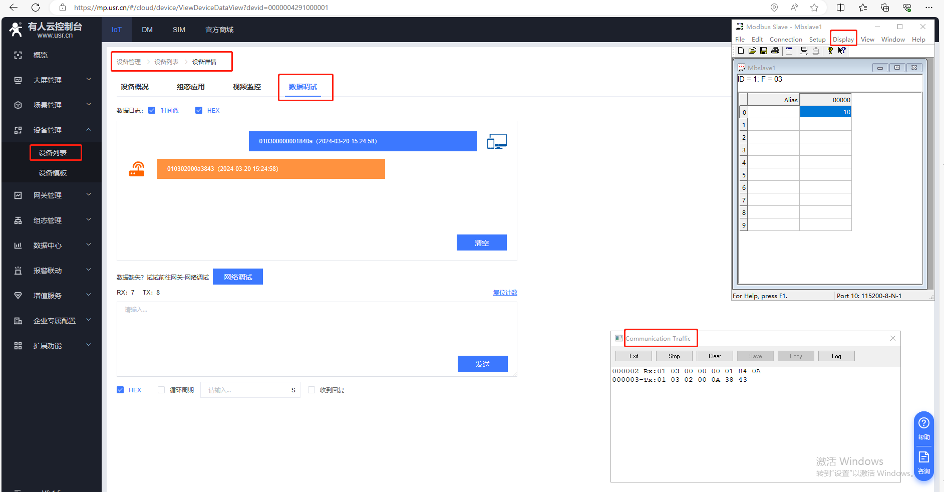 還可以利用有人云的數據調試功能,查看有人云的數據收發是否正常。