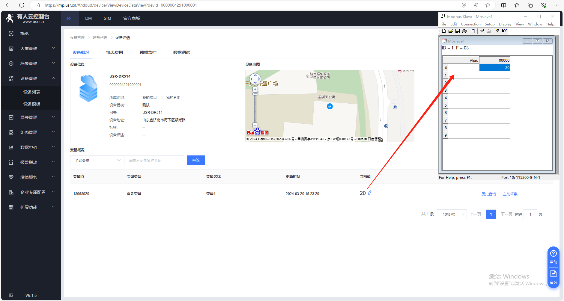 3、有人云寫數據20,MODBUS slave數據變為20。