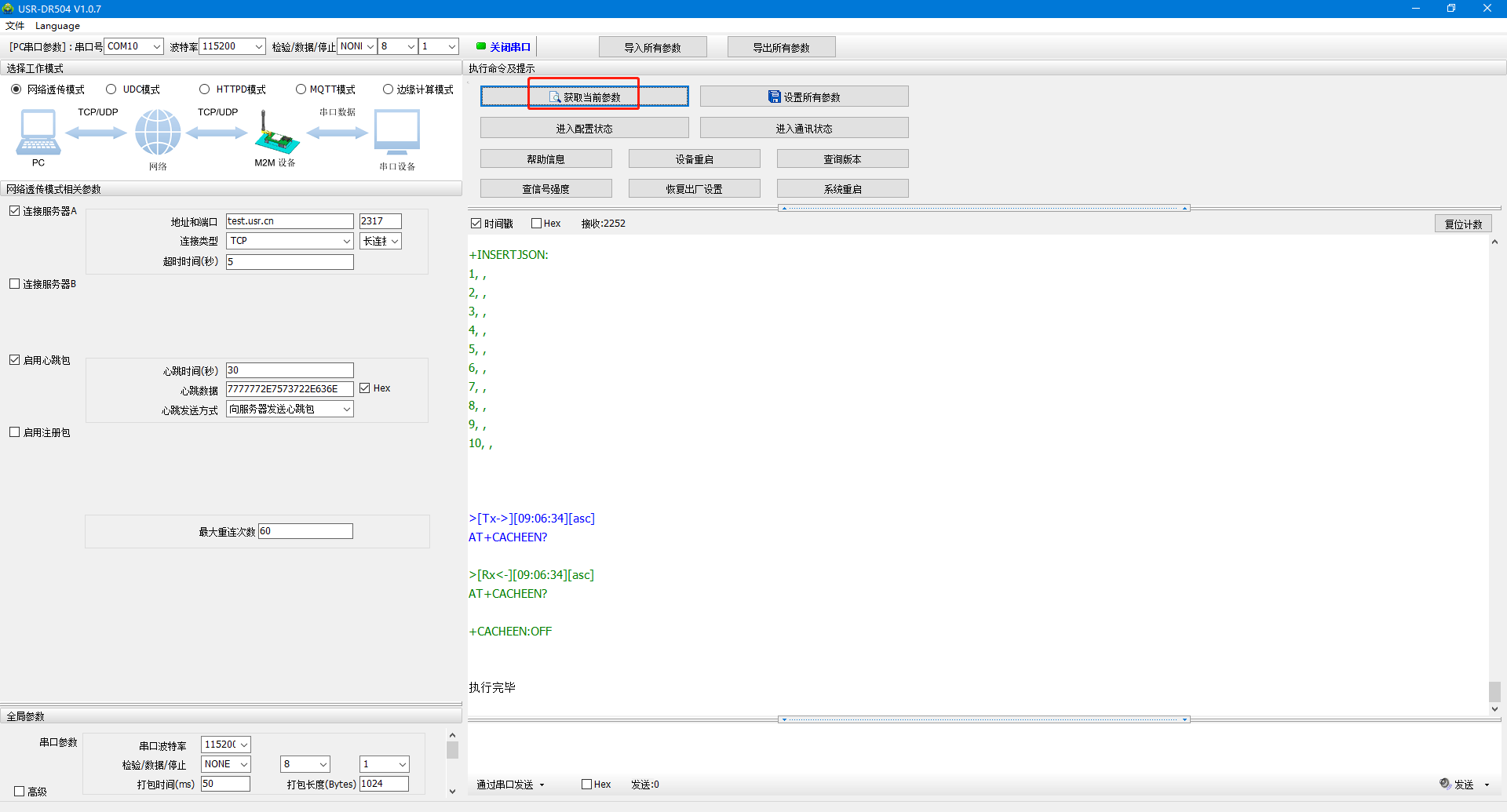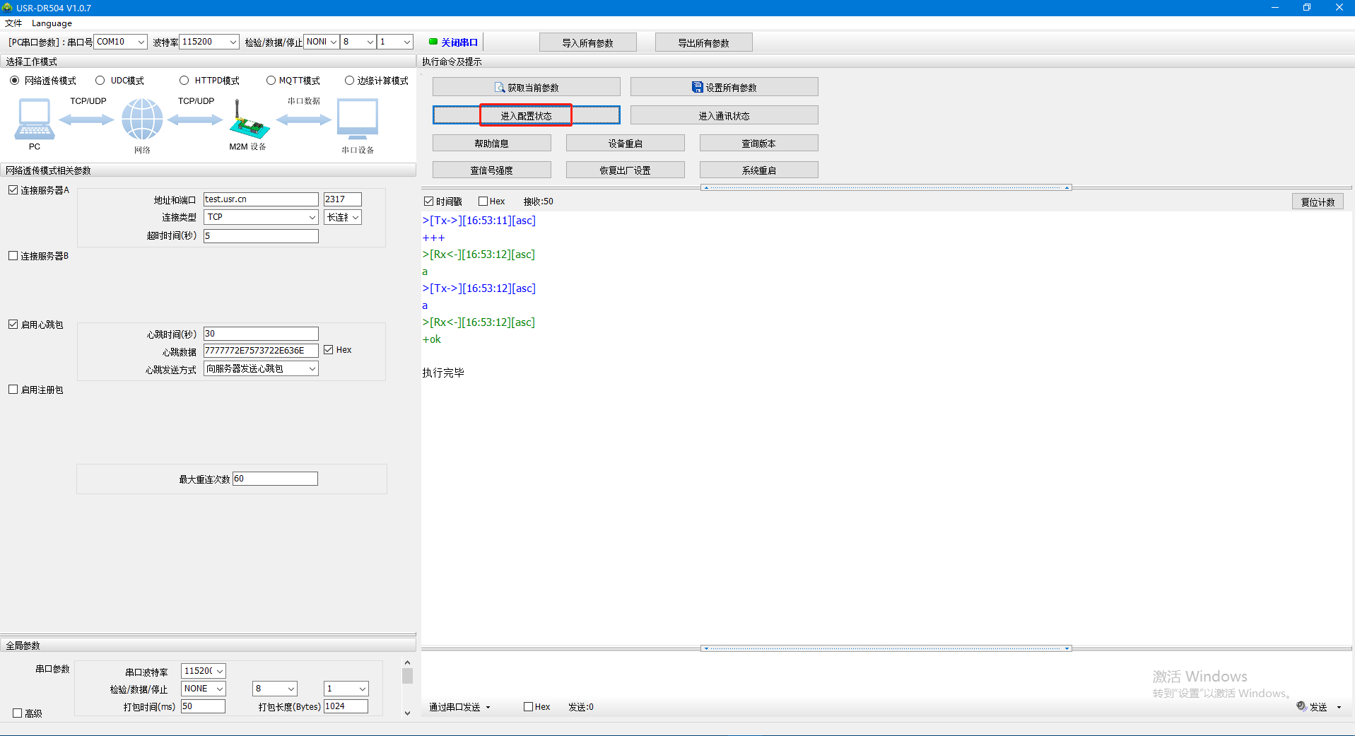 (1)USR-DR514,點擊進入配置狀態,點擊獲取當前參數,數據格式設置透傳,點擊設置所有參數,點擊設備重啟,最后關閉串口。