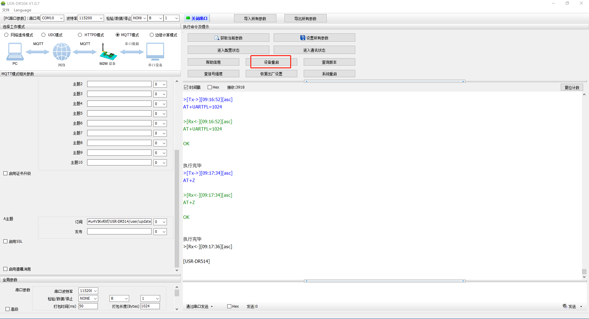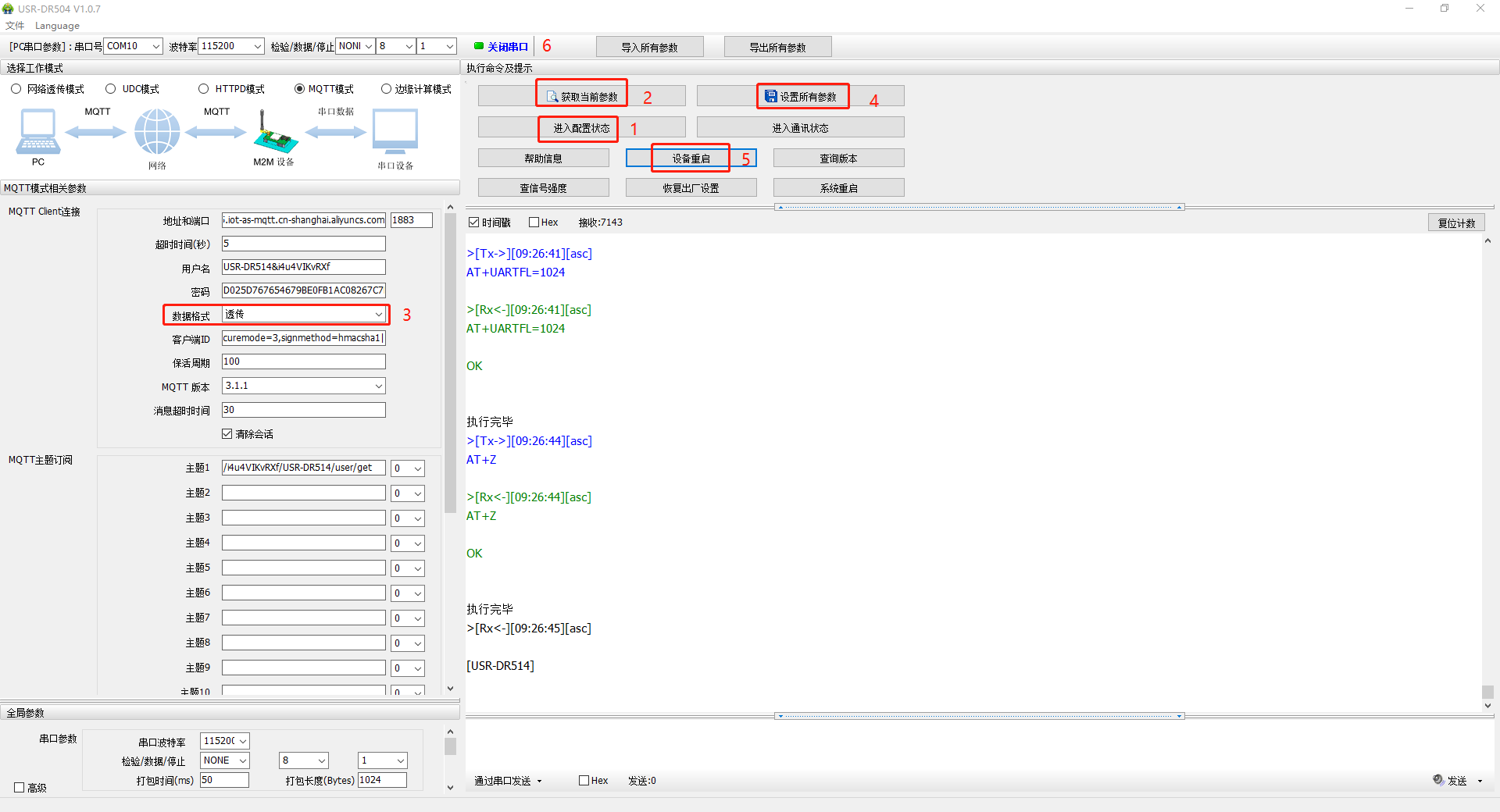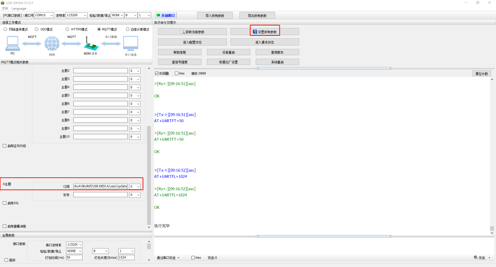 發布主題:/i4u4VIKvRXf/USR-DR514/user/update,設置軟件點擊設置所有參數
