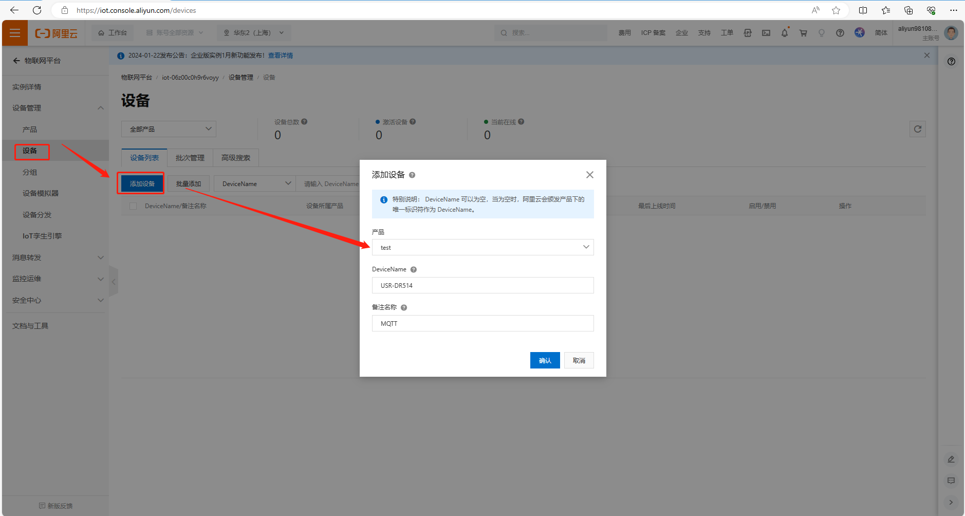 (1)產品創建成功后,添加設備。點擊設備,點擊添加設備,產品名舉例填test,DeviceName填USR-DR514,備注名稱填MQTT,點擊確認。