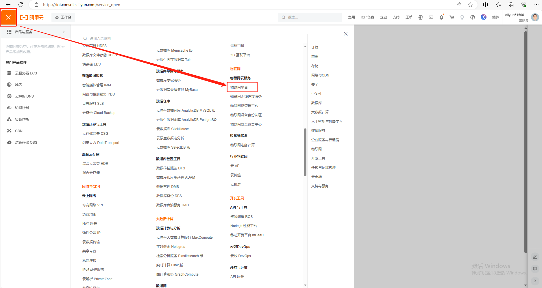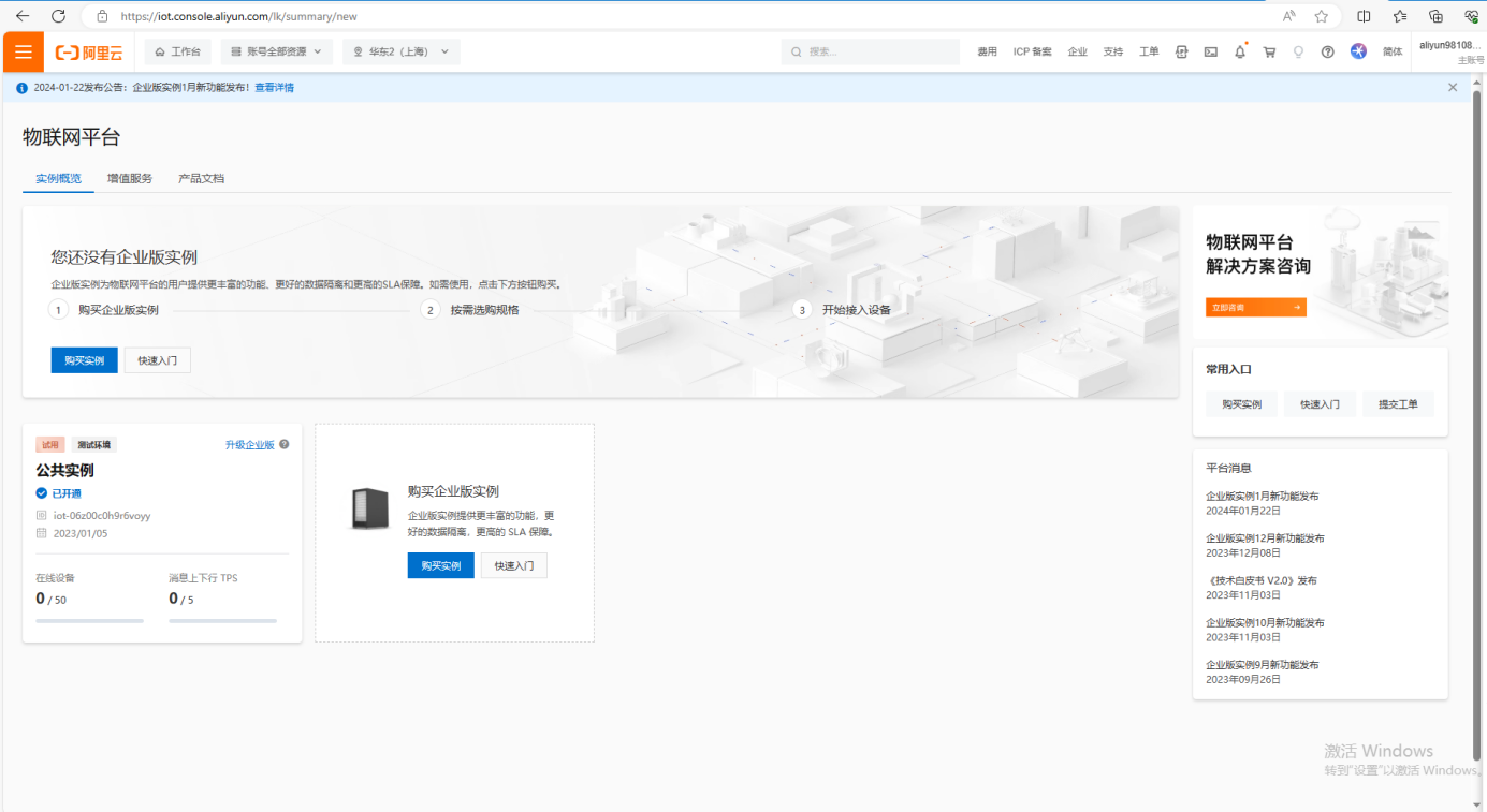 1、登陸阿里云平臺,找到物聯網平臺,這里用的連接公共實例