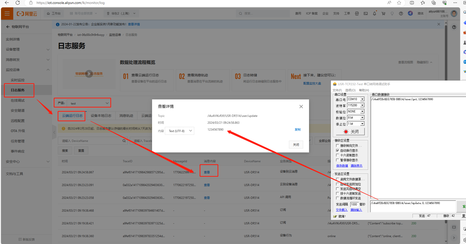 (3)USR-DR514使用串口助手發送數據/i4u4VIKvRXf/USR-DR514/user/update,0,1234567890,發送完成之后,我們在阿里云平臺可以通過日志服務,點擊查看,看到USR-DR514串口發到阿里云的數據1234567890。