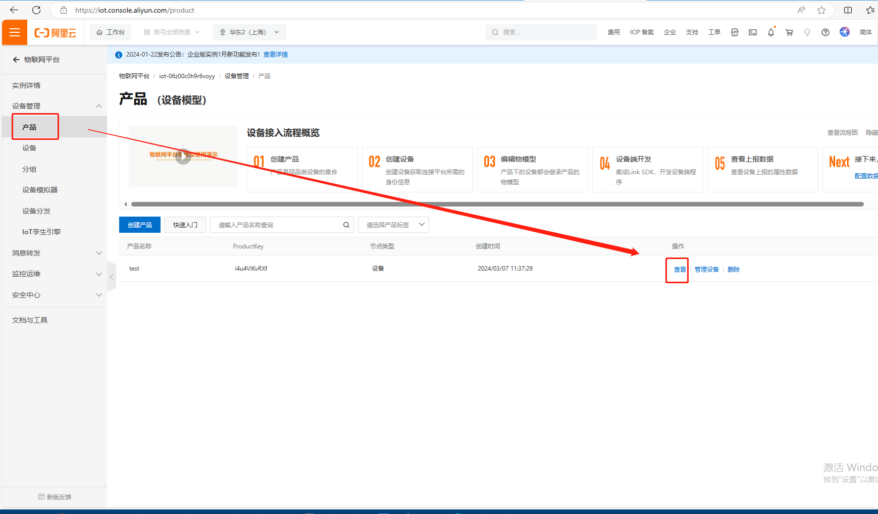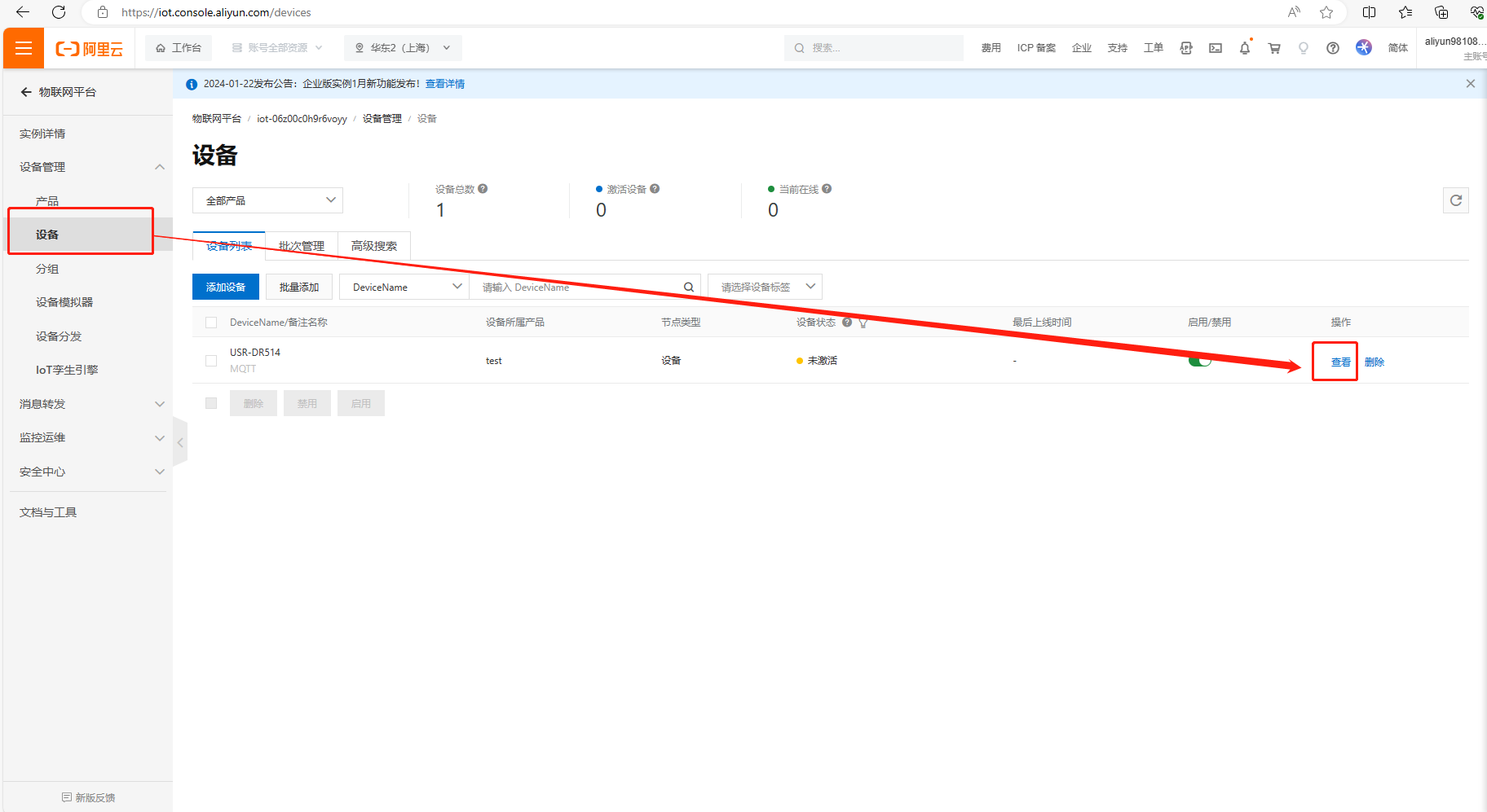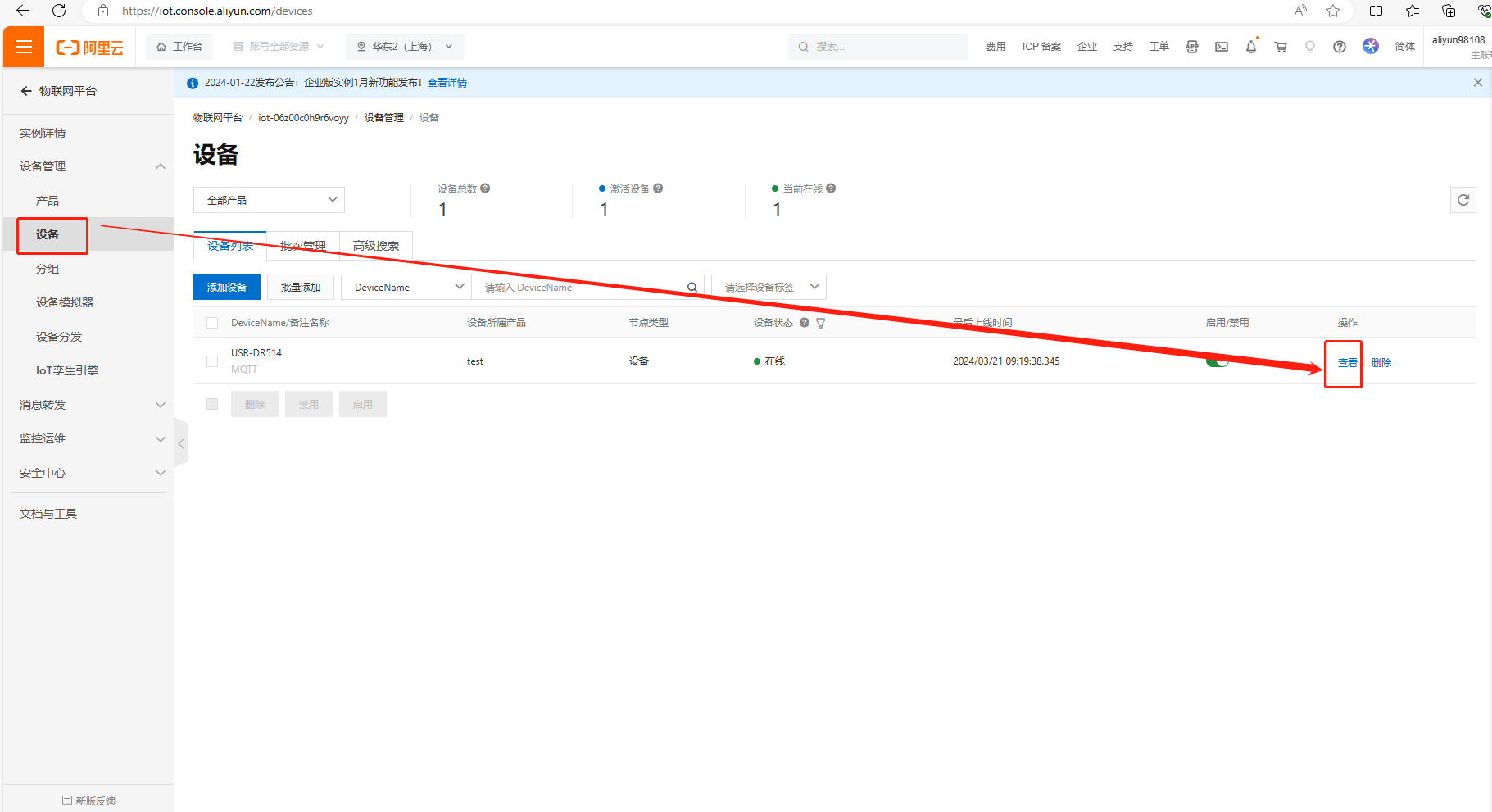 (2)登陸阿里云平臺,點擊設備,點擊查看