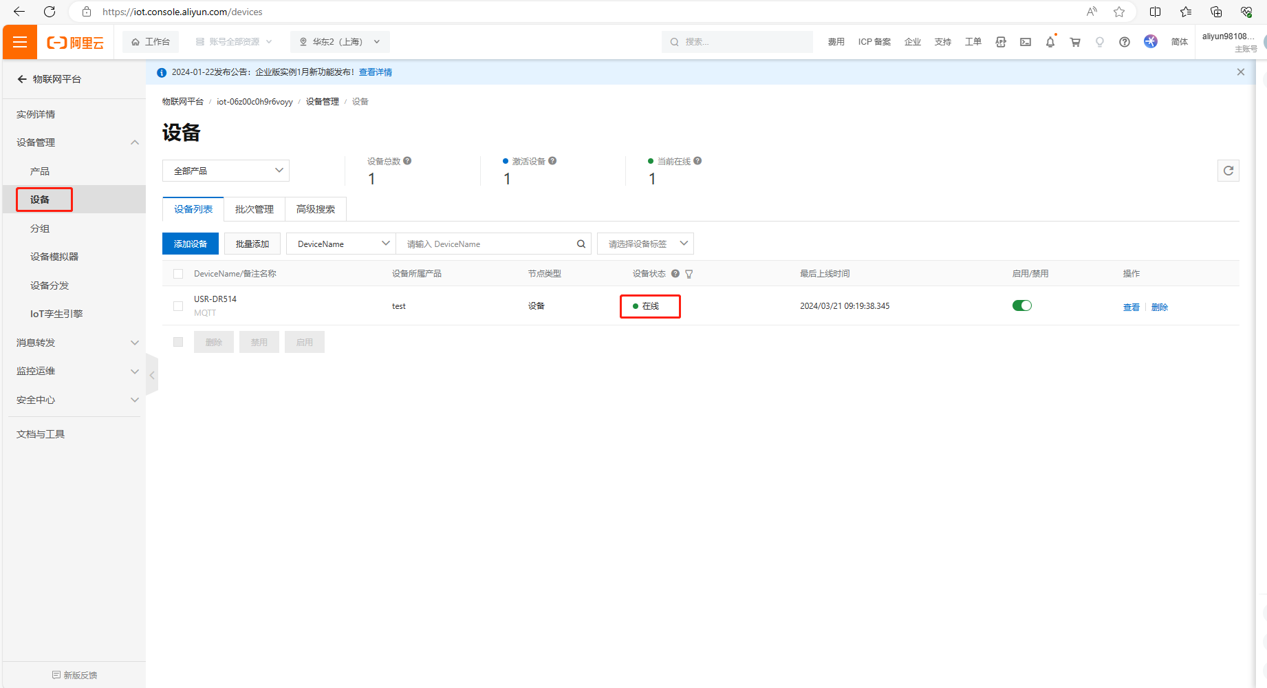 USR-DR514 設置完MQTT連接阿里云參數,聯網正常,在阿里云平臺可以看到設備狀態是在線。
