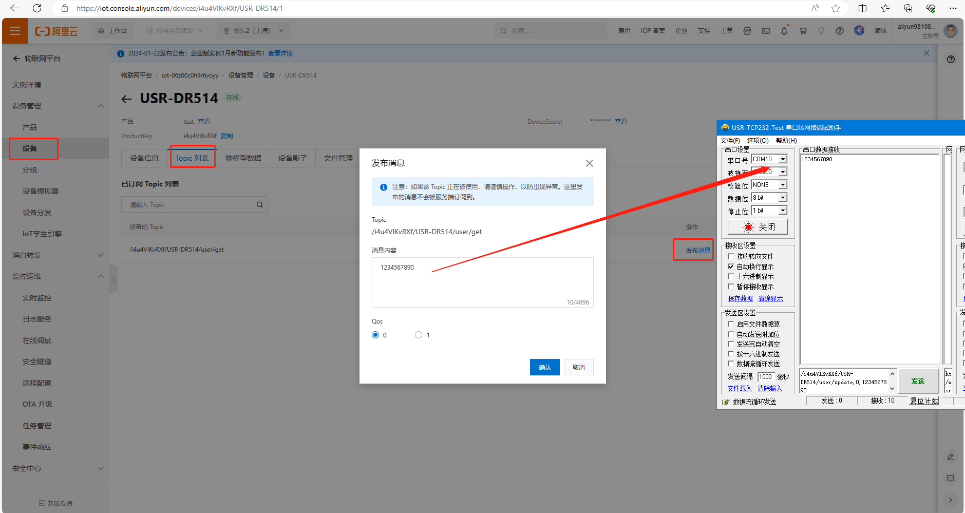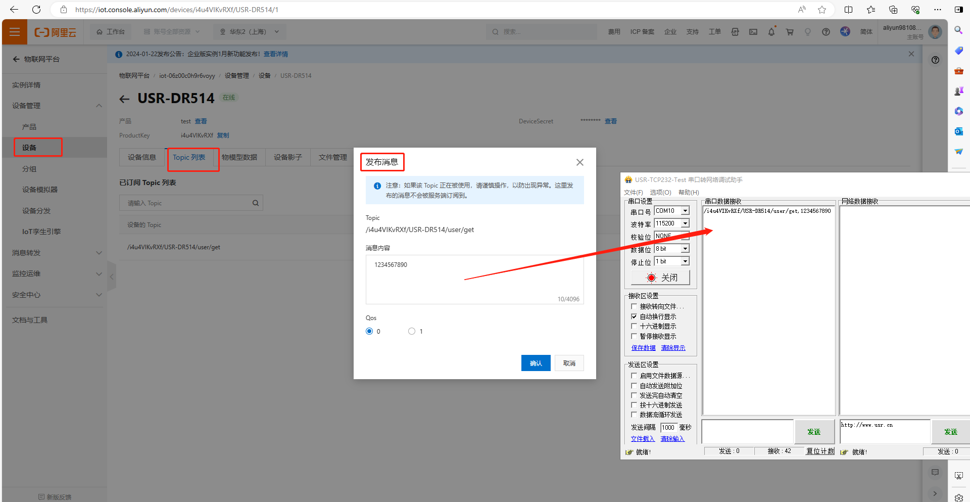 (3)使用阿里云平臺發布的消息m.0575400.com,被USR-DR514訂閱到,并通過USR-DR514串口發給串口端,數據格式是格式化輸出,串口助手接收的數據/i4u4VIKvRXf/USR-DR514/user/get,m.0575400.com