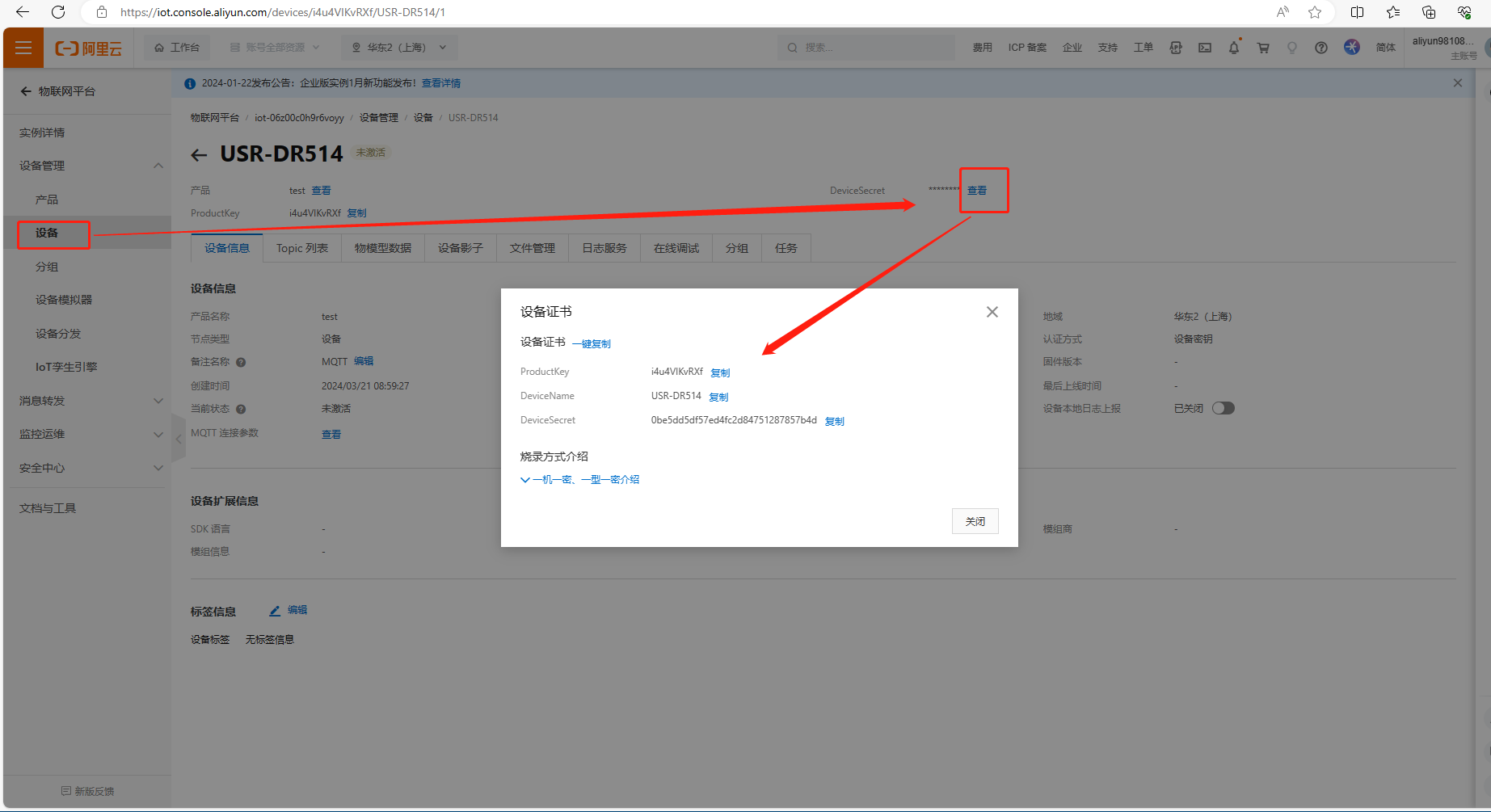 (1)點擊設備,點擊查看,再點擊DeviceSecret后面的查看。