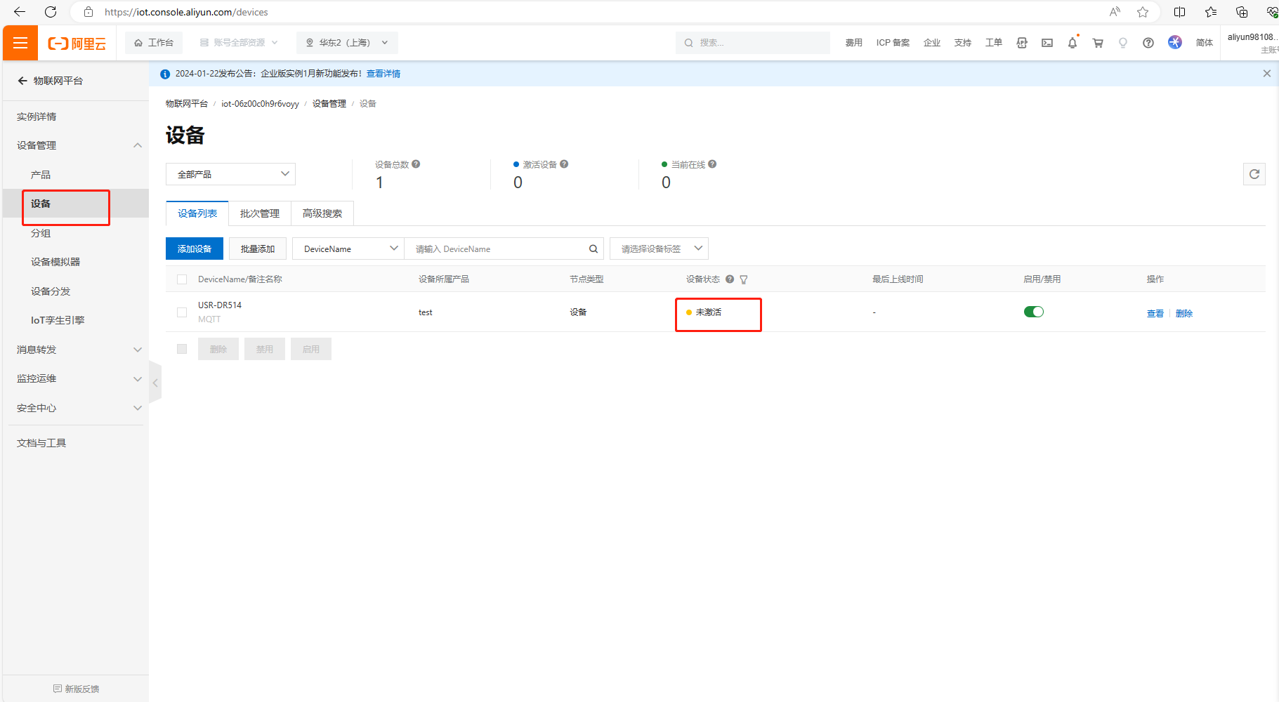 (2)添加完設備,如下圖展示,設備狀態是未激活,等設置完USR-DR514的MQTT連接阿里云參數之后,設備狀態才顯示在線。