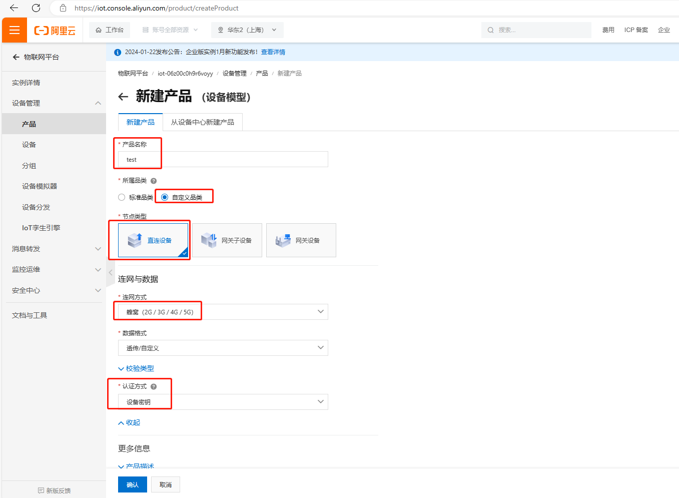 產品名稱舉例test——所屬品類選擇自定義品類——節點類型選擇直連設備——聯網與數據聯網方式選擇蜂窩(2G/3G/4G/5G)——數據格式選擇透傳/自定義——認證方式選擇設備秘鑰——點擊確定,完成創建產品。
