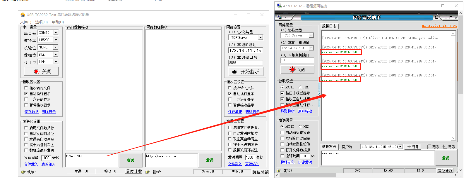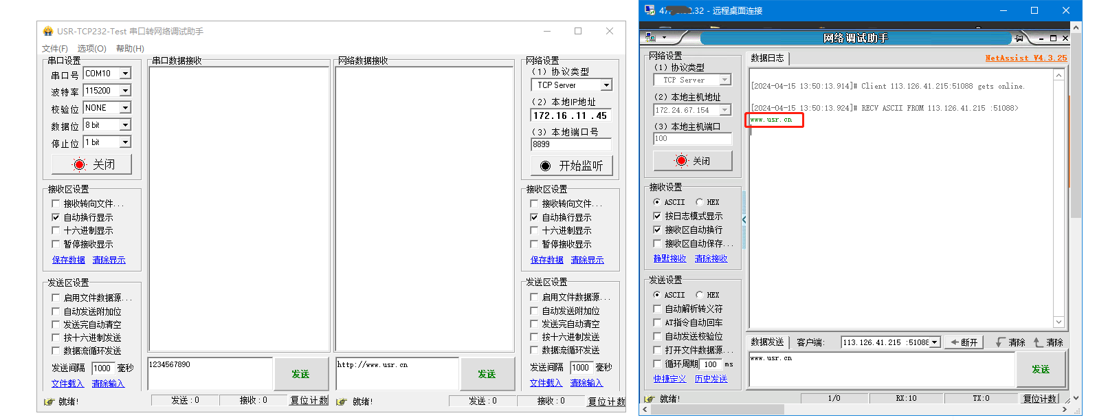 登陸遠程桌面連接,打開一個網絡助手,協議類型TCP server,服務器IP,本地端口100和DR514一樣,點擊連接。