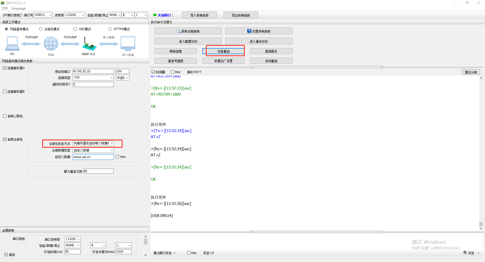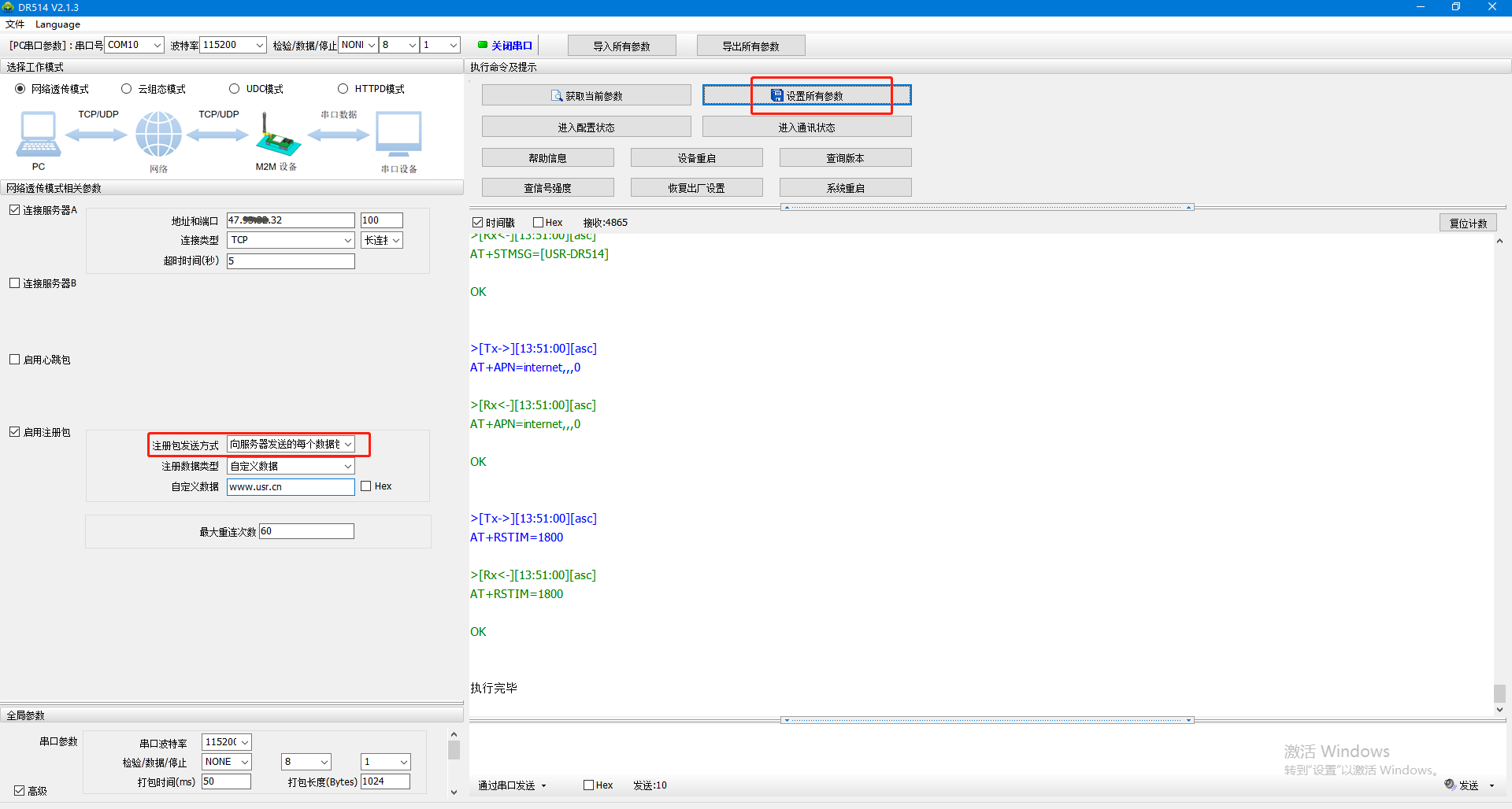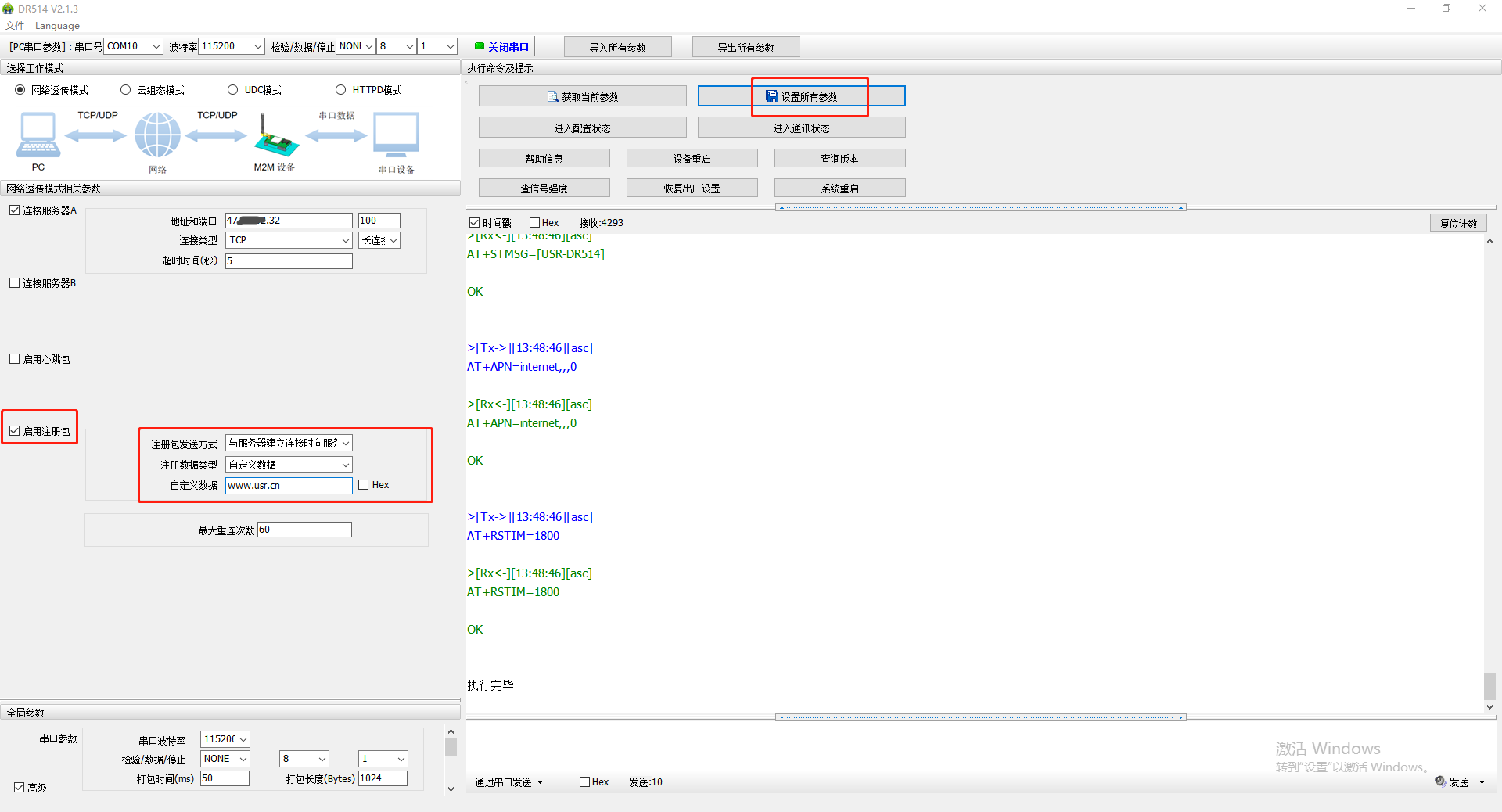 設置軟件重新打開串口,點擊進入配置狀態,點擊獲取當前參數,注冊包發送方式選向服務器發送的每個數據包前都加上,注冊數據類型用自定義數據,自定義數據m.0575400.com,點擊設置并保存所有參數。