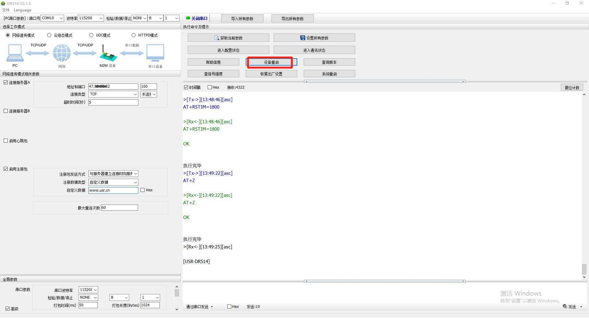 4、勾選連接服務器A,地址設置遠程服務器IP,端口100,連接類型TCP,長連接,勾選啟用注冊包,注冊包發送方式選與服務器建立連接時向服務器發送一次,注冊數據類型用自定義數據,自定義數據m.0575400.com,點擊設置所有參數。點擊設備重啟,然后再關閉串口。