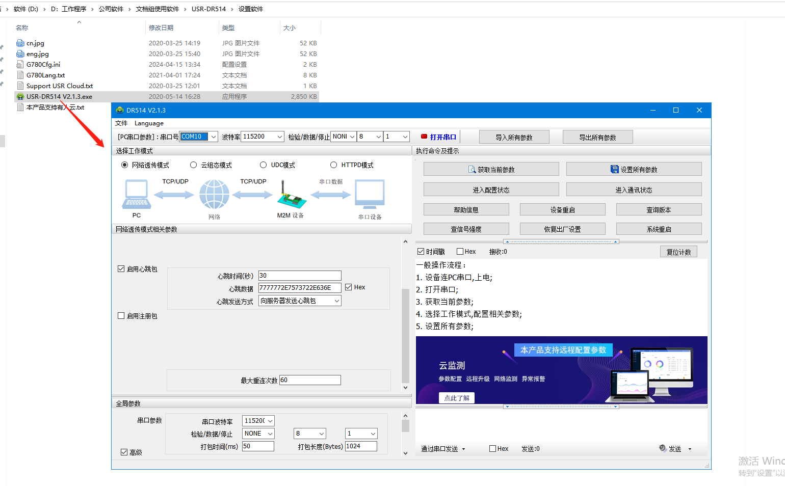 USR-DR514的485串口接USB-RS485串口線到電腦USB口,接好4G天線,插好外置SIM卡,然后產品接220V交流端子供電電源線,上電(220V交流電供電注意安全)。
