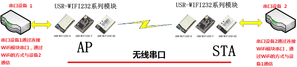 這一應用中,兩個USR-WIFI23低功耗模塊通過WIFI點對點連接,如圖所示,該組網方式為用戶設備搭建了一個透明串口通路。