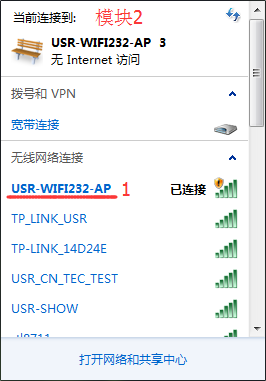 當模塊2(STA)啟動后會找模塊1(AP)的SSID(USR-WIFI-T)。然后模塊2TCP client 端連接模塊1的TCP server。所有連接自動完成。然后兩邊的UART就可以透明傳輸數據。