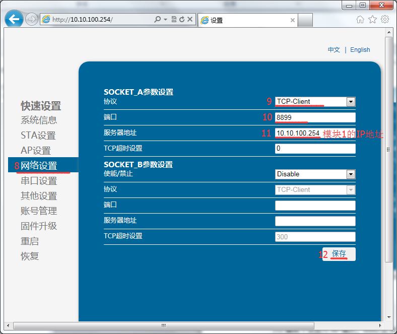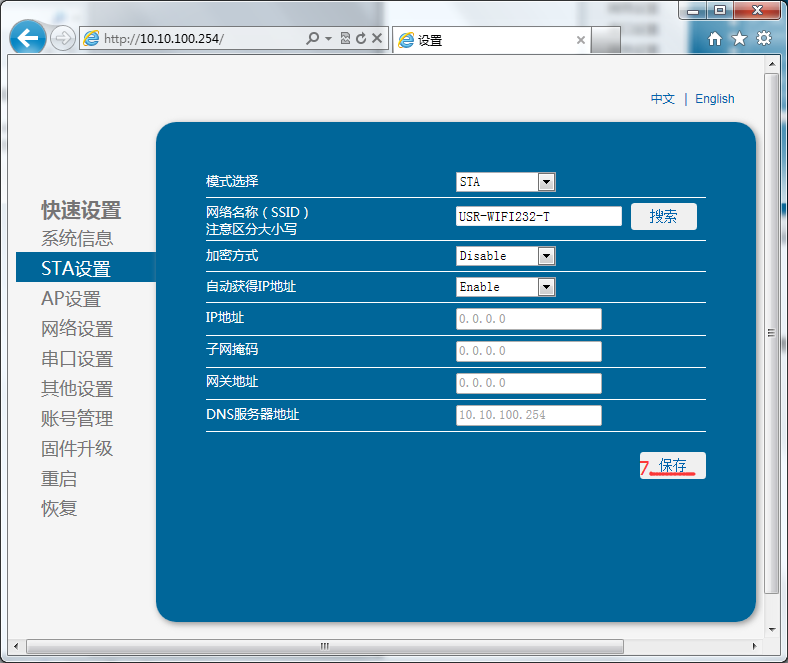 b.打開瀏覽器(推薦使用IE),輸入10.10.100.254,賬戶密碼admin,進入模塊的網頁, STA設置選項做如下設置。
