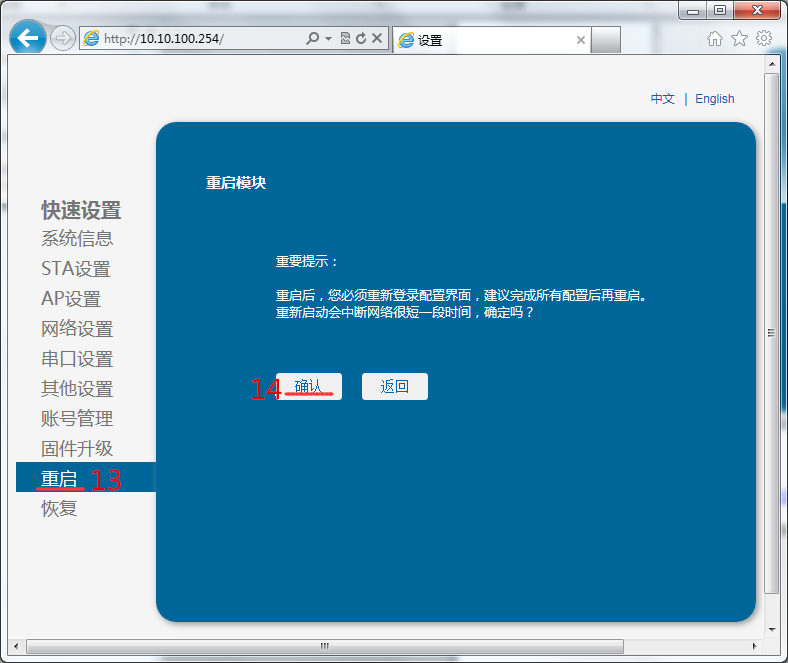 (1)AP模塊1在設置時參數保持默認就可以,如果之前修改過參數,可將模塊恢復出廠設置。
