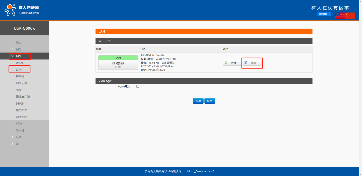 為了避免網段沖突,修改lan口為192.168.2.1。在網絡--LAN點擊修改,修改完成后點擊應用,等待一分鐘后給設備斷電重啟。