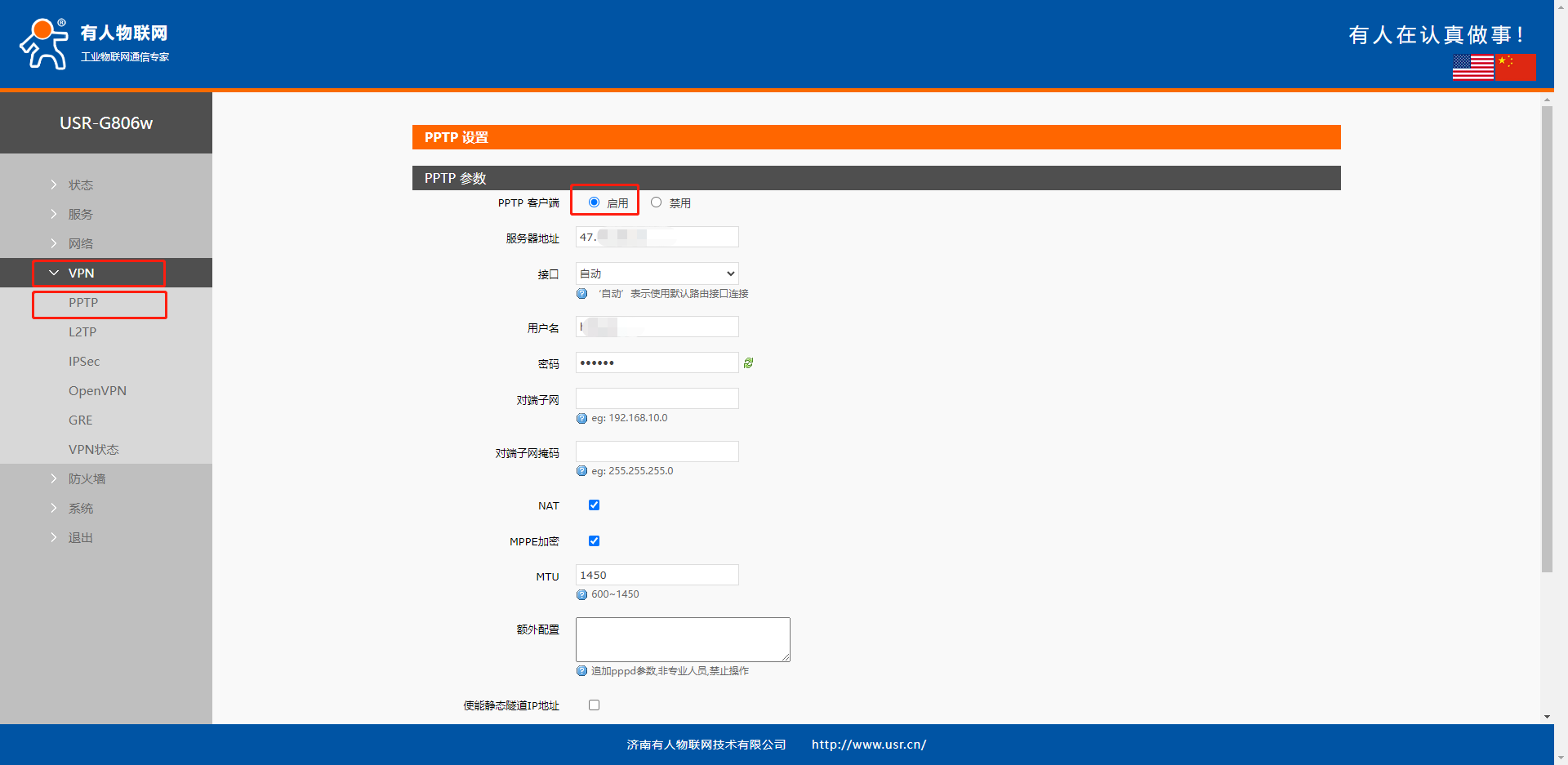 在VPN--PPTP勾選啟用,相關參數與服務器對應。