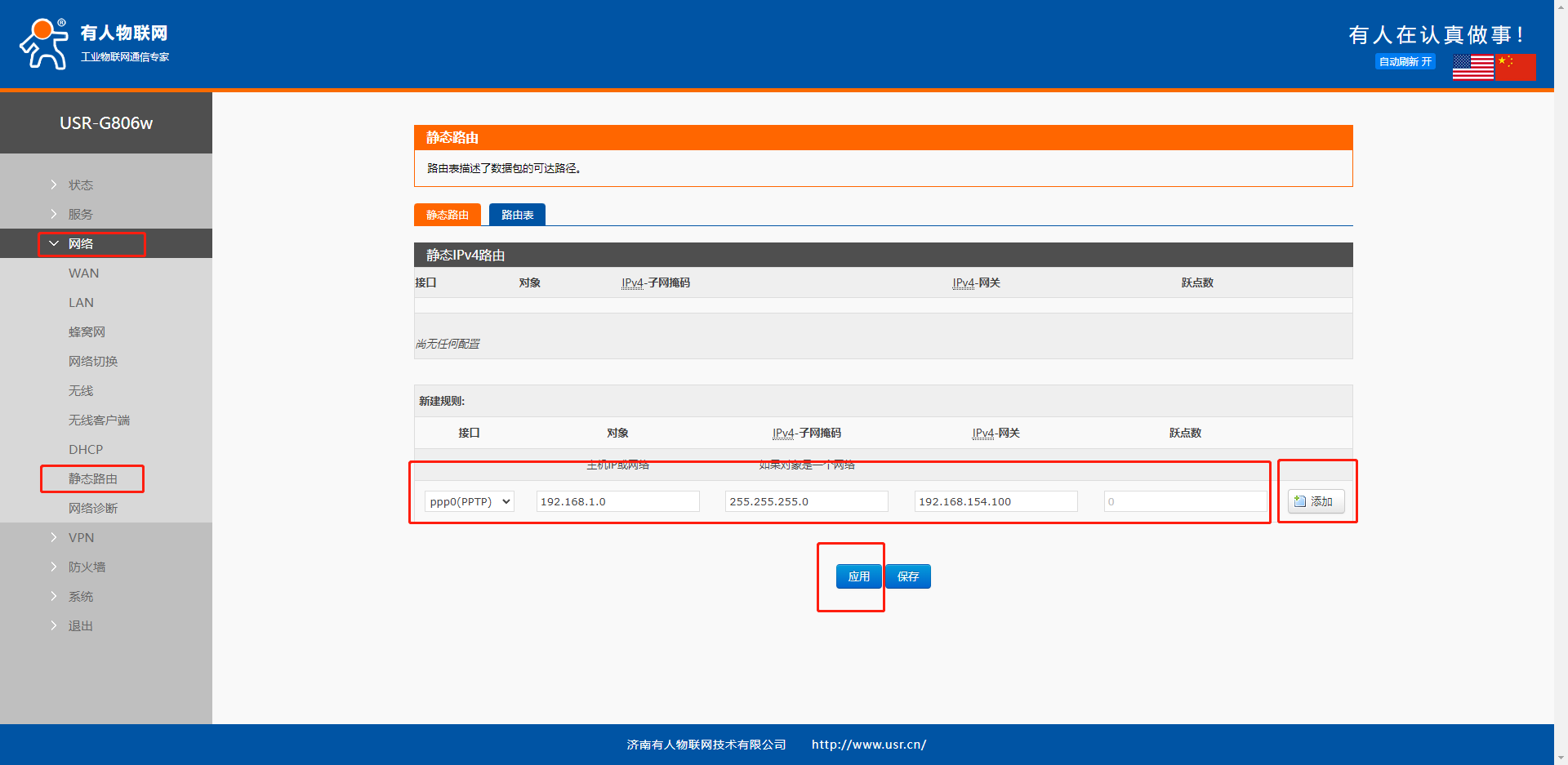 接口選擇PPTP,對象為對端子網的IP或者網段,子網掩碼與設備對應,網關可填服務器地址或者對端VPN ip,躍點數可根據需要設置。設置完成后點擊添加。