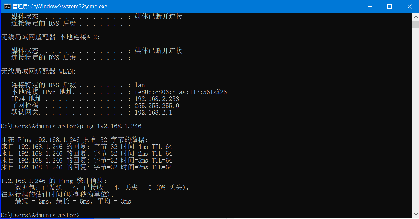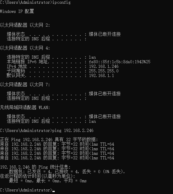 全部設置完成后,兩臺電腦互相ping對端電腦(注意:電腦多網卡時請帶對應的網卡ping)。