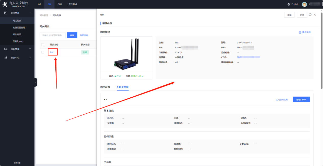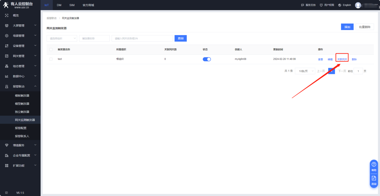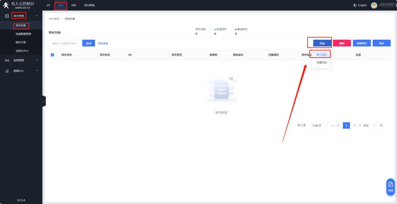 進入有人云后點擊左上角的DM,在網關管理--網關列表,點擊右上角添加。這里點擊的是添加--單個添加。