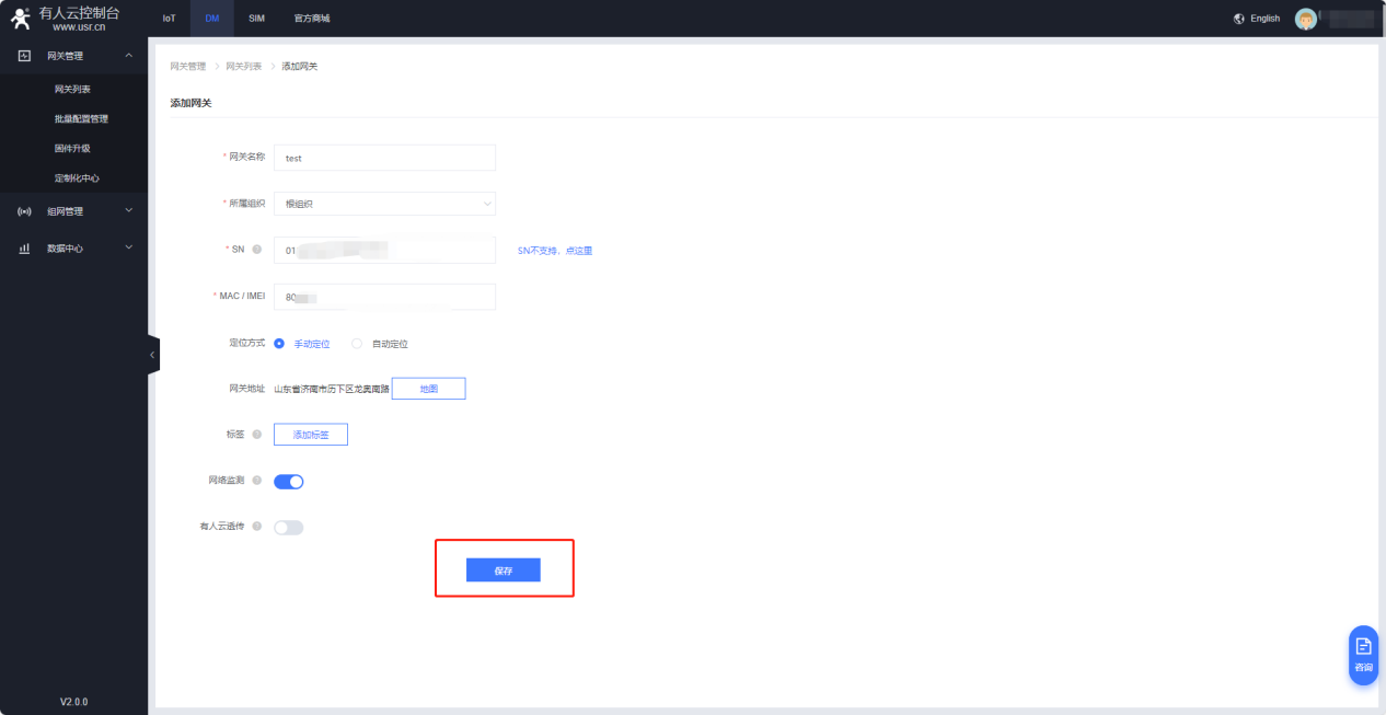 網關名稱自定義,選擇要添加到的組織。sn和imei可在設備小標簽或內置網頁-狀態-總覽查看。選擇網絡檢測,不要開啟有人云透傳。其他參數自定義。設置完后點擊保存。