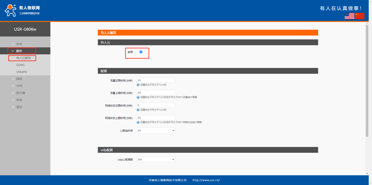 G806w支持在有人云添加。其他型號路由器在21年之后買的且有SN的,支持在有人云添加。路由器默認開啟有人云功能。可在內置網頁修改設備的流量記錄和上報時間、網絡狀態記錄和上報時間、心跳包時間和Udp心跳周期,同時支持使用私有部署的有人云。