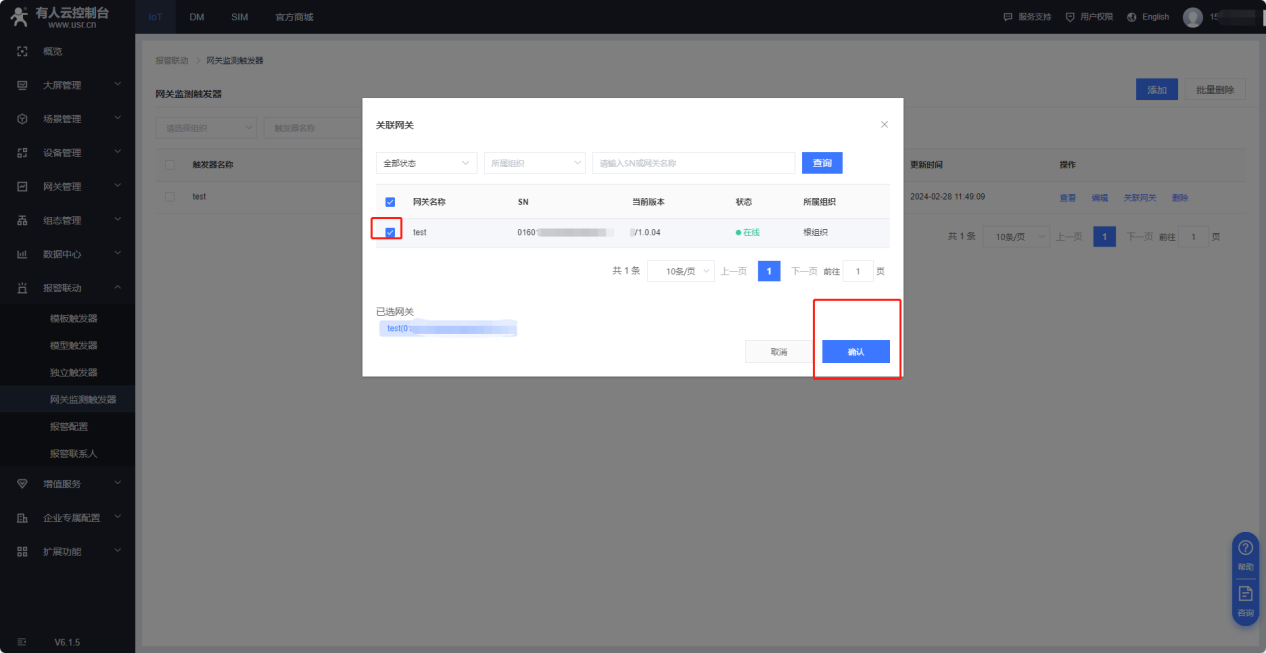 可在IOT--報警聯動--網關監測觸發器,根據需要設置報警內容。比如網關離線時間、掉線次數、信號強度、流量消耗等。設置完成后點擊確認。