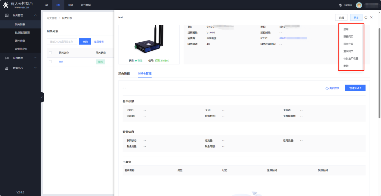 點擊右上角的更多,可以禁用網關,打開配置網頁,固件升級,重啟網關,恢復出廠設置以及刪除當前網關。