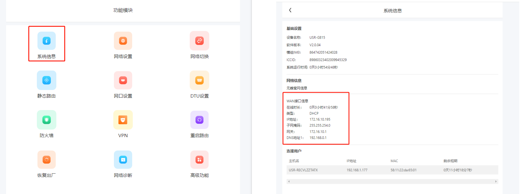 2、G815的WAN口連接上級路由,可以從內置網頁看到上級路由給G815分配的WAN IP:172.16.10.195, 注意WAN LAN IP不能沖突。