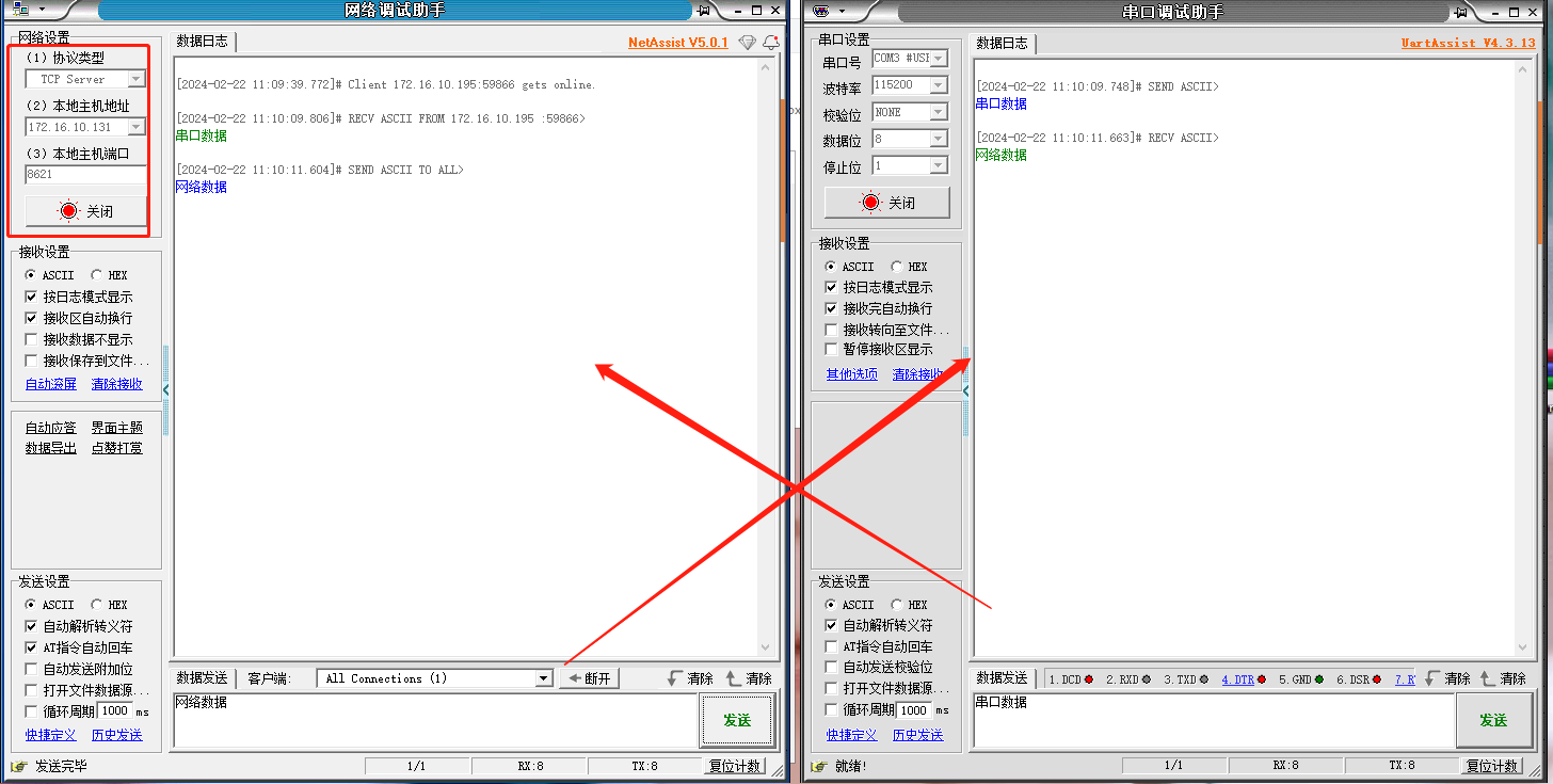 即可實現串口到網絡的數據傳輸。