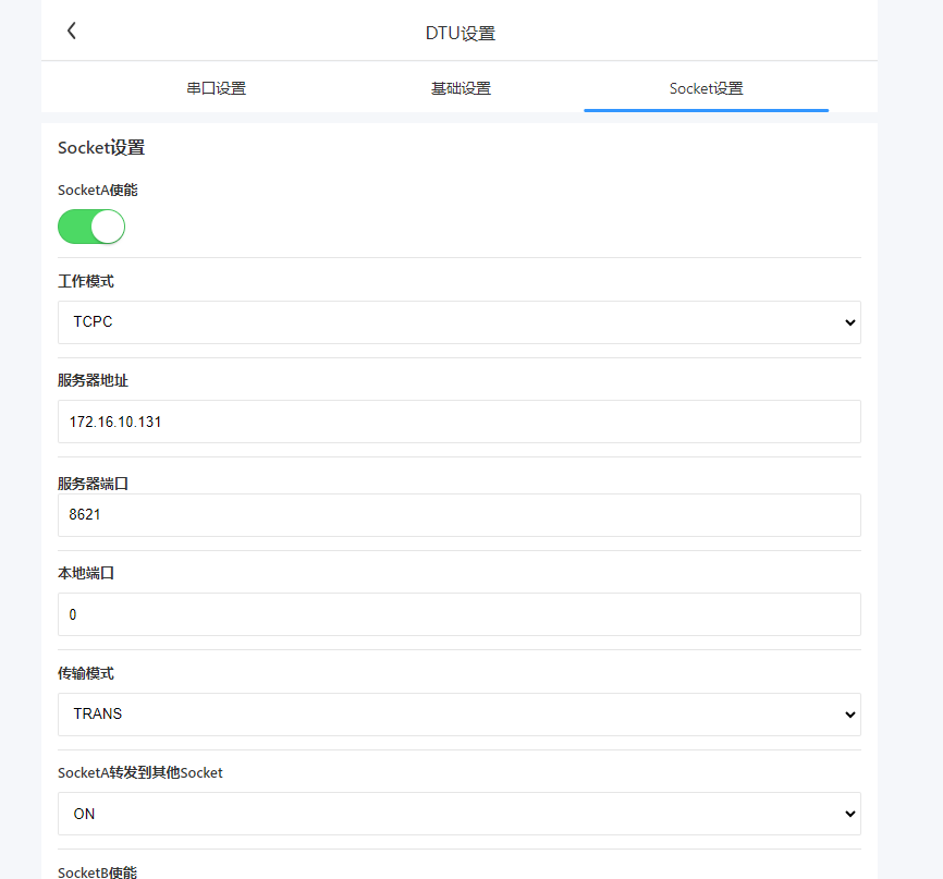 5、socket設置--配置G815為TCPC,連接遠程服務器地址和端口。保存重啟生效。