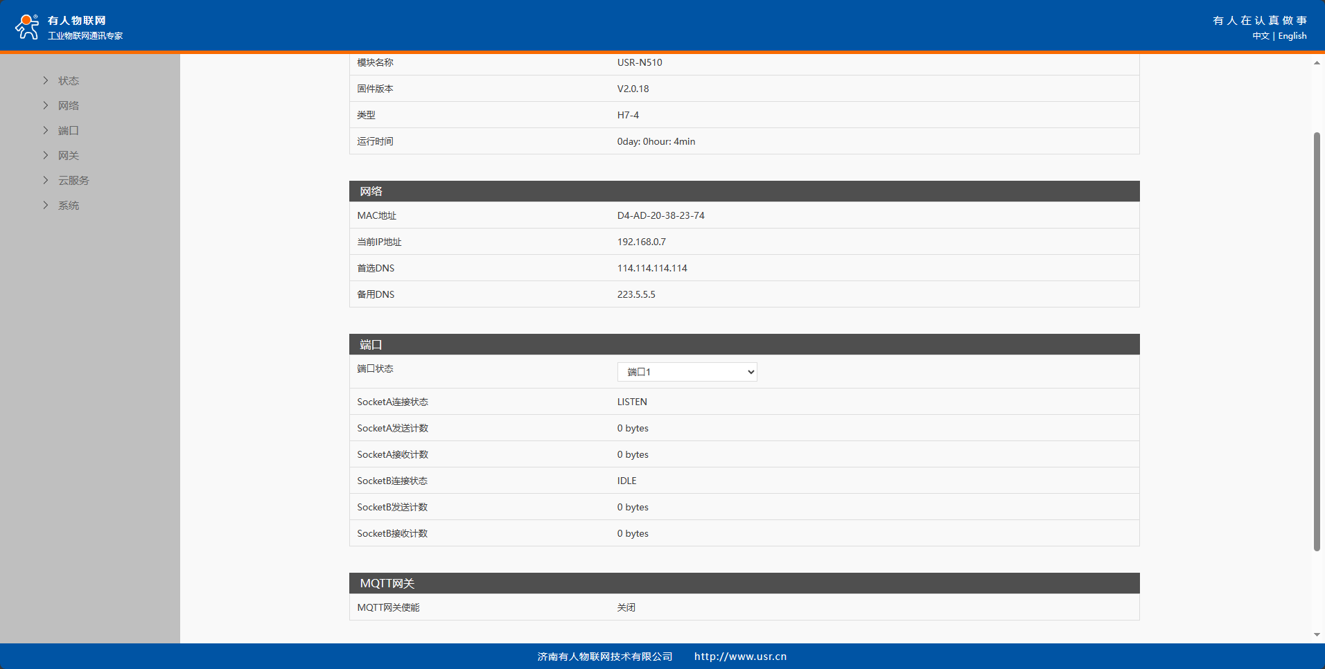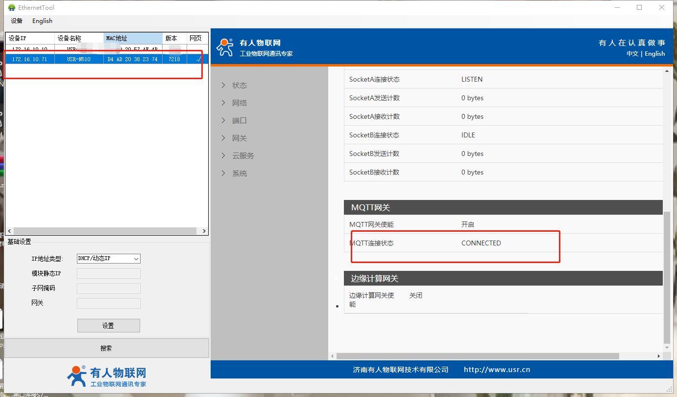 保存并應(yīng)用參數(shù),在系統(tǒng)中重啟設(shè)備。將設(shè)備的網(wǎng)口和電腦插入同一個(gè)路由器。打開N510設(shè)備的內(nèi)置網(wǎng)頁(yè),點(diǎn)擊搜索,我們可以看到路由器給N510設(shè)備此時(shí)分配的ip地址。雙擊ip可以進(jìn)入到配置界面。在狀態(tài)下我們可以進(jìn)一步看到mqtt的鏈接狀態(tài)