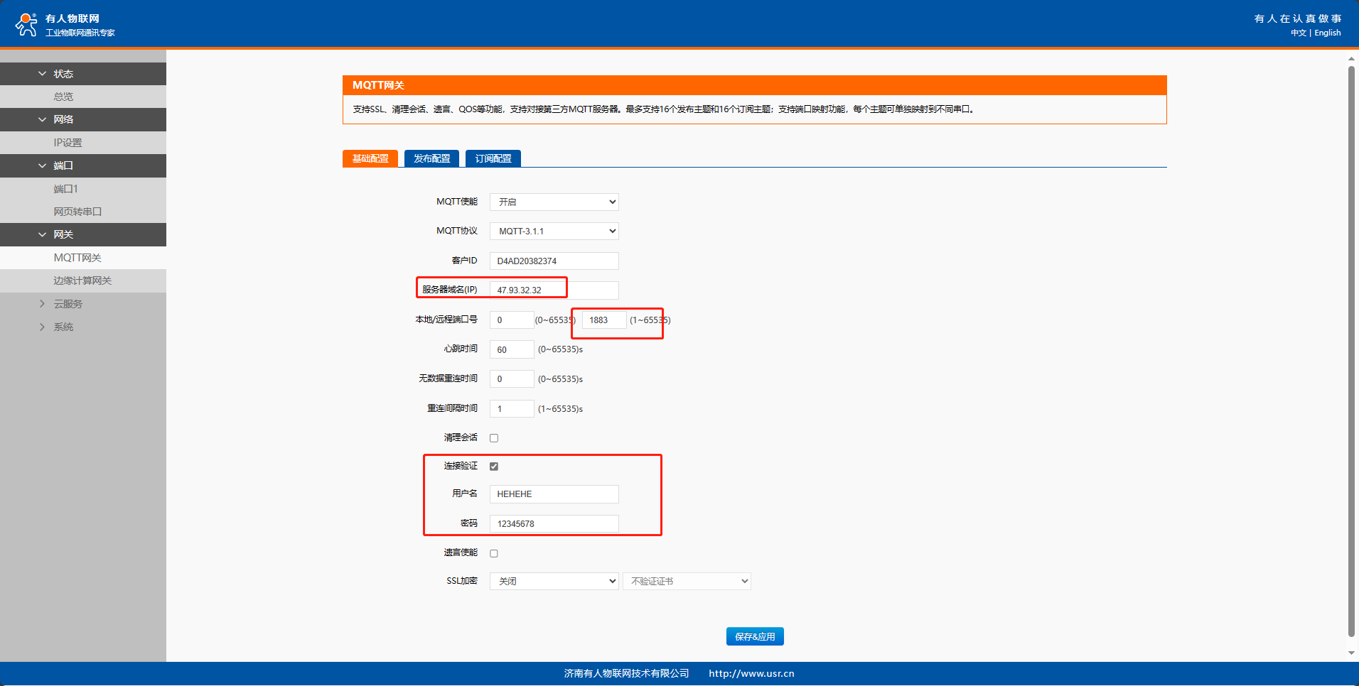 打開網(wǎng)關(guān)--MQTT網(wǎng)關(guān)界面,開啟MQTT使能,進(jìn)一步配置mqtt服務(wù)器相關(guān)參數(shù)。注:客戶ID盡量避免123456等常規(guī)數(shù)字,可以使用設(shè)備mac來(lái)代替。