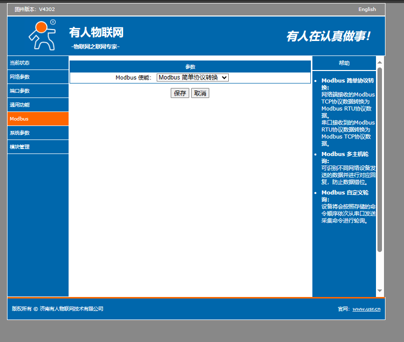 切換到modbus界面,開啟modbus 使能,點擊保存并重啟設備。