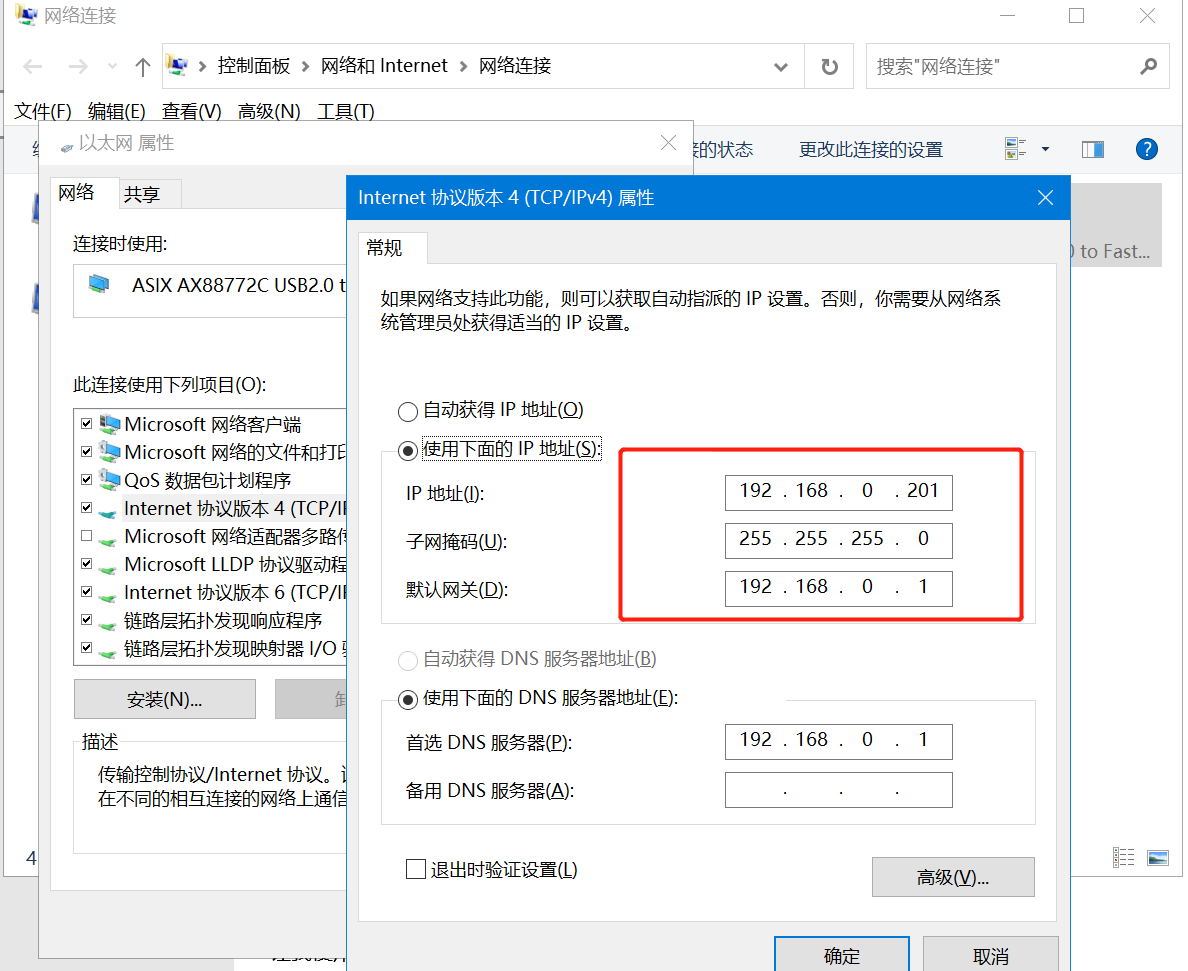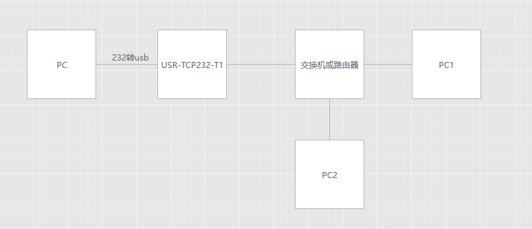USR-TCP232-T1 網口用網線連接交換機,電腦網口接交換機,電腦IP和T1的IP設置同一網段。USR-TCP232-T1 默認IP是192.168.0.7。因此電腦設置靜態IP,192.168.0.201,子網掩碼 255.255.255.0,網關192.168.0.1。