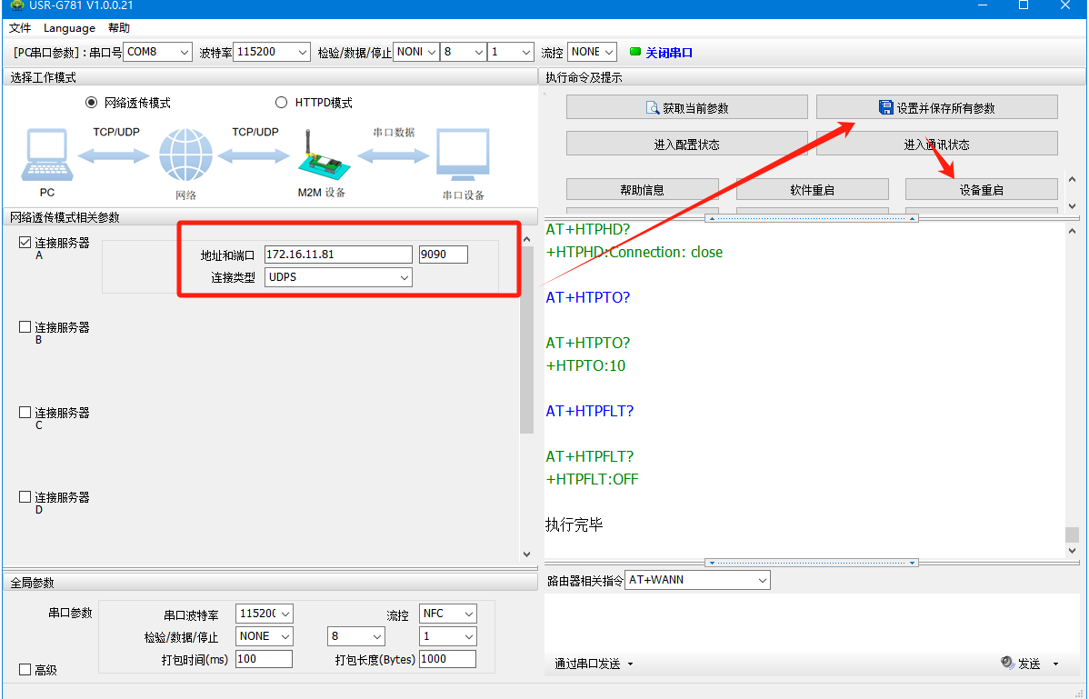 (5)勾選鏈接服務器A,填寫PC的IP和監聽端口,鏈接類型選擇UDPC,即UDC Client。設置完參數點擊“設置并保存所有參數”,執行完畢后,點擊軟件重啟,待串口打印啟動信息,如“USR-G781”,代表設備重啟完畢。
