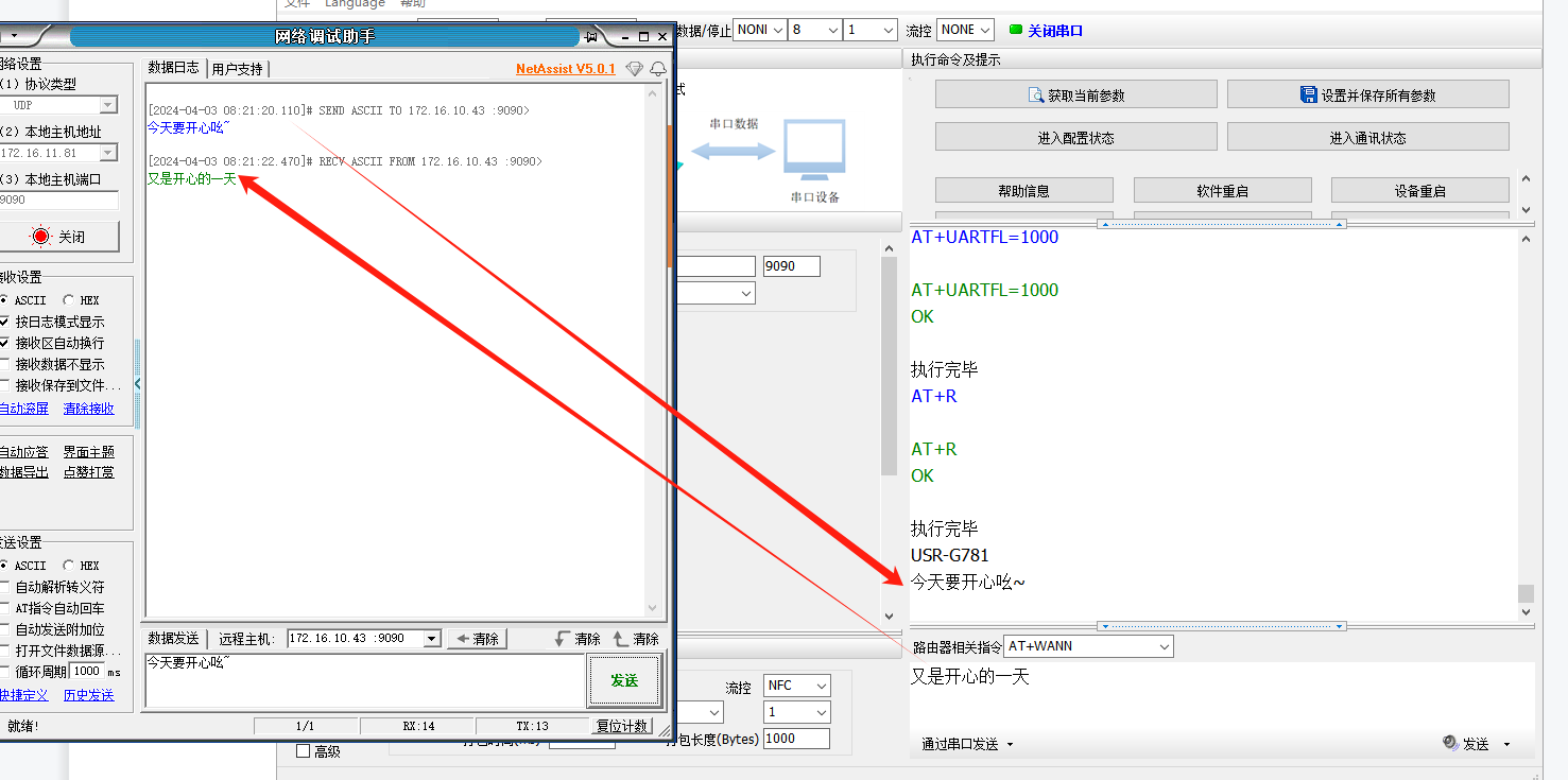 1、在串口上發數據,UDP服務器上就能收到。
