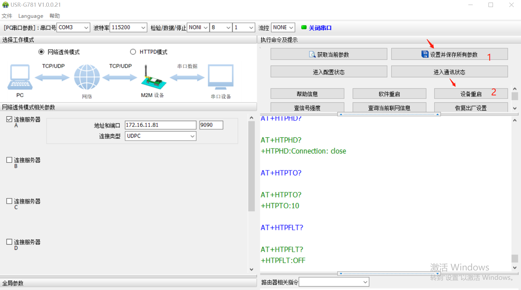 (5)勾選鏈接服務器A,填寫PC的IP和監聽端口,鏈接類型選擇UDPC,即UDC Client。設置完參數點擊“設置并保存所有參數”,執行完畢后,點擊軟件重啟,待串口打印啟動信息,如“USR-G781”,代表設備重啟完畢。
