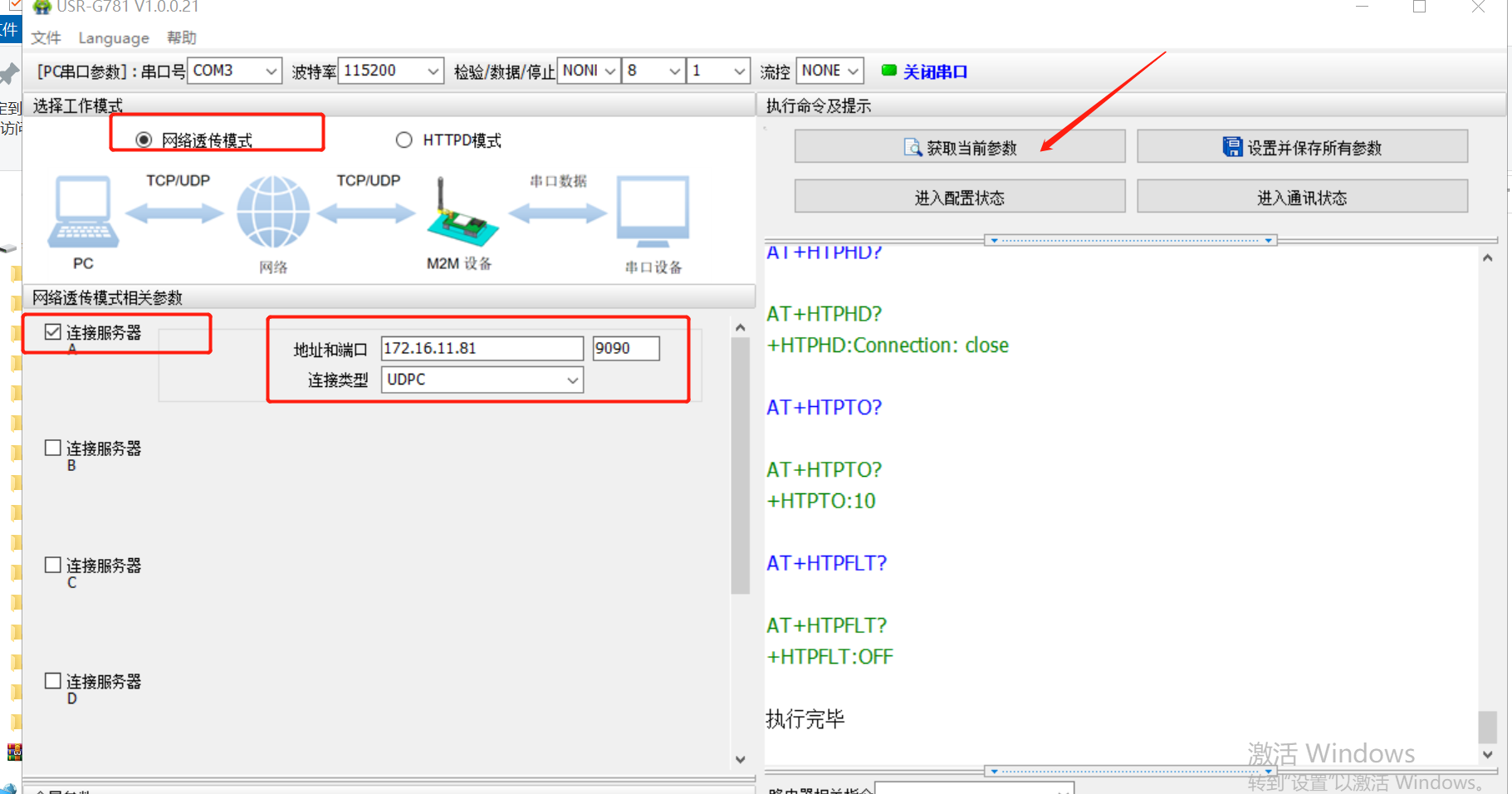 (4)獲取當前參數----設置工作模式為“網絡透傳模式”,
