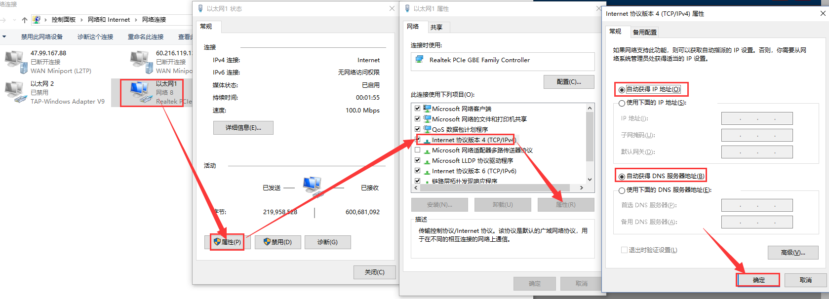(1)打開網絡共享中心,雙擊對應的網絡適配器,點擊屬性,選擇IPv4,點擊屬性,修改電腦為自動獲取IP,然后點擊確定。(此處講得是同個局域網下進行通信,如果電腦本來就是自動獲取IP,這一步可以跳過)點擊詳細信息可以查看到電腦獲取的IP地址:
