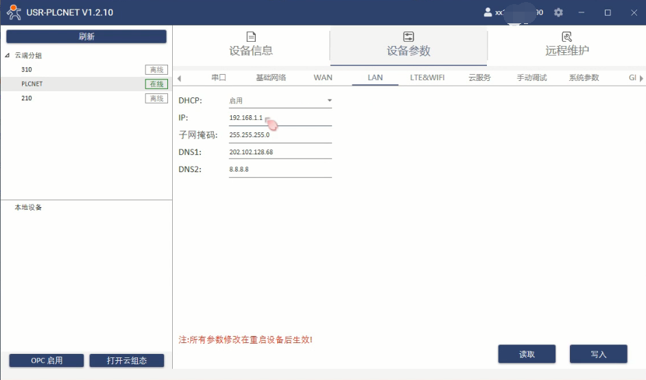 打開plcnet配置軟件,lan口ip配置與plc同網段但不能相同(如plc ip為192.168.1.11,plcnet設置為192.168.1.1),配置完成后右下角寫入參數,重啟網關生效